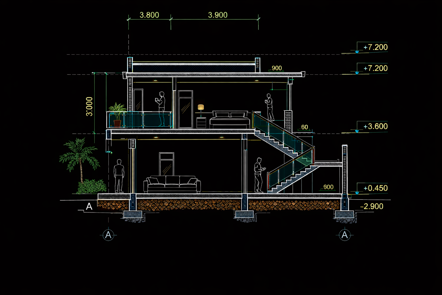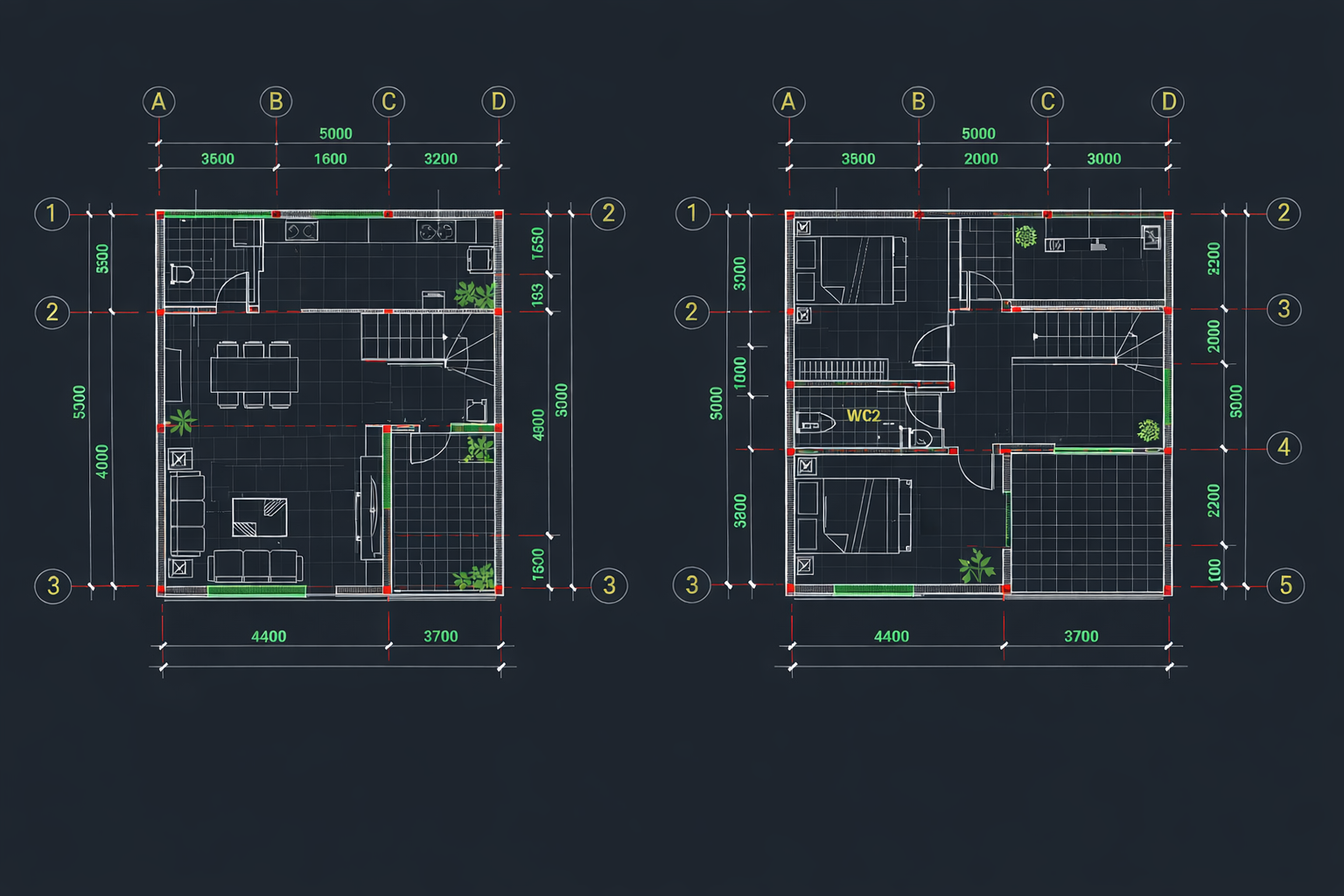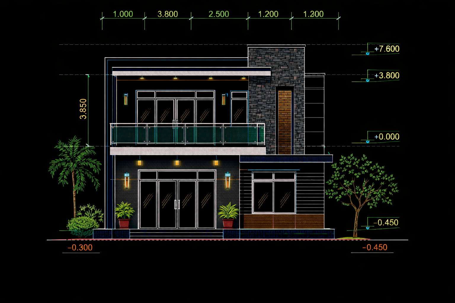 Bản vẽ AutoCAD kiến trúc nhà 2 tầng là cơ sở định hình toàn bộ công trình, được thực hiện trên AutoCAD - phần mềm thiết kế kỹ thuật chuyên dụng trong lĩnh vực kiến trúc và xây dựng, cho phép thể hiện bản vẽ 2D, 3D với độ chính xác cao về kích thước và tỷ lệ. Thông qua các bản vẽ mặt bằng, mặt đứng và mặt cắt, nhu cầu sinh hoạt, gu thẩm mỹ và logic tổ chức không gian được chuyển hóa thành cấu trúc kiến trúc rõ ràng, khả thi. Đồng thời, đây cũng là nền tảng để phối hợp chính xác giữa kiến trúc, kết cấu và hệ thống kỹ thuật, góp phần kiểm soát chi phí và đảm bảo chất lượng công trình trong suốt quá trình thi công và sử dụng.