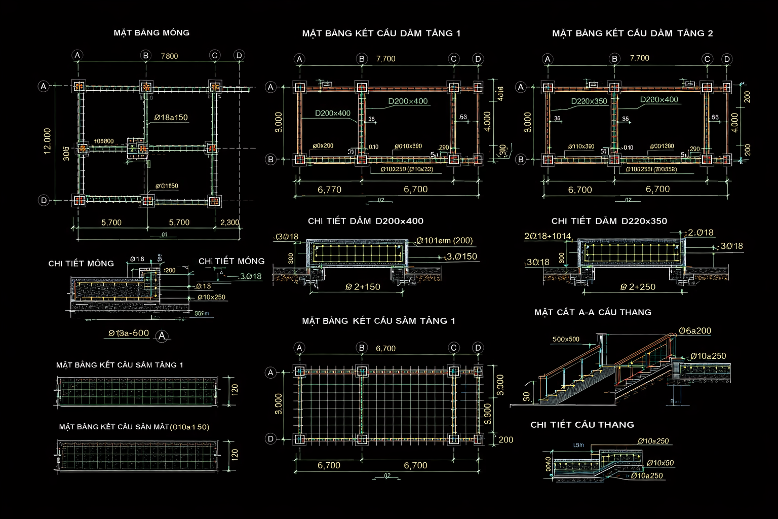 Bản vẽ kết cấu nhà 2 tầng là tập hợp các bản vẽ kỹ thuật thể hiện hệ khung chịu lực của công trình, bao gồm móng, cột, dầm, sàn và các chi tiết liên kết. Đây là cơ sở để tính toán khả năng chịu tải, đảm bảo độ an toàn, ổn định và tuổi thọ cho ngôi nhà trong suốt quá trình sử dụng.
