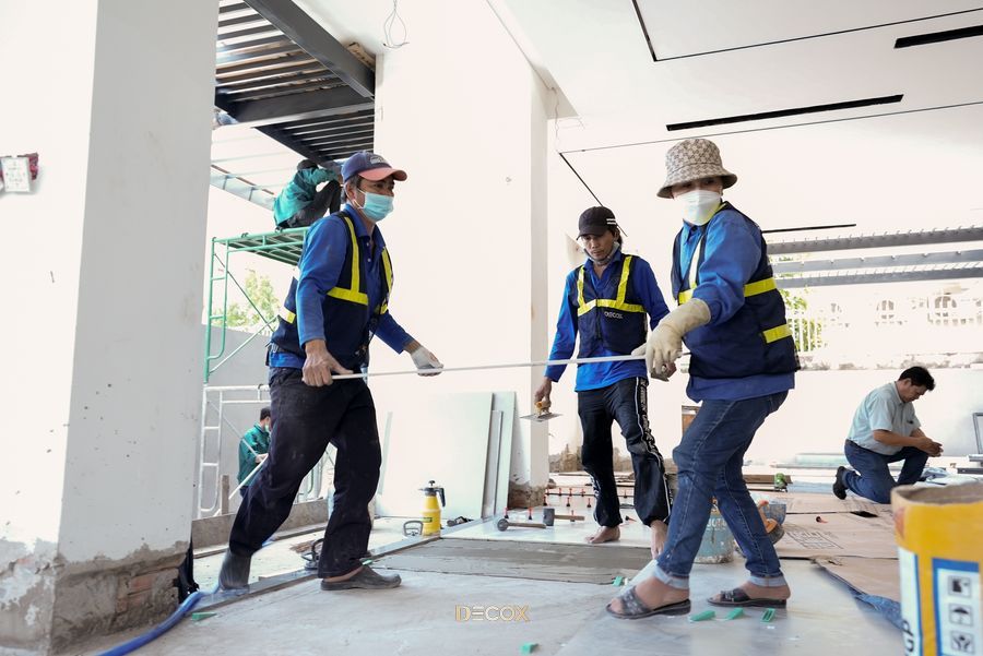 - Láng sàn: Đây là công việc cần thực hiện trước khi thi công ốp lát gạch cho nhà phố. Ở giai đoạn này, chủ đầu tư cần lưu ý về độ bằng phẳng sau khi nền đã được láng phẳng bằng vữa xi măng - Ốp lát bề mặt trần, tường, sàn