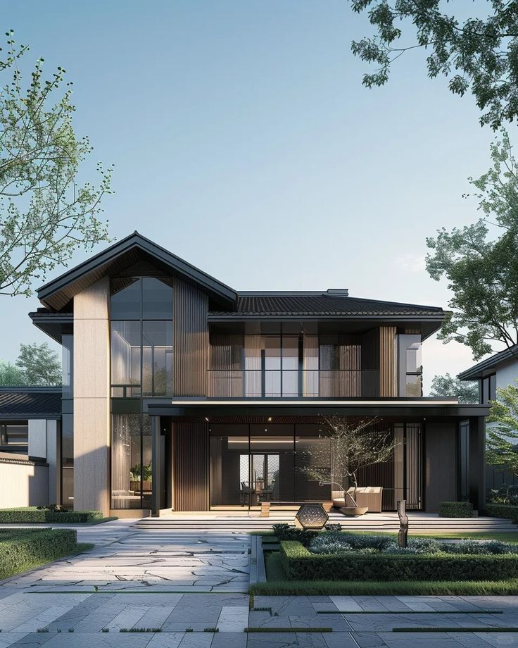 Biệt thự 2 tầng mái Nhật hiện đại ghi dấu ấn với đường nét kiến trúc tinh tế, tối giản, kết hợp mái dốc nhẹ chữ A đặc trưng, tạo cảm giác thanh thoát và sang trọng. Các khối nhà được bố trí cân đối, hài hòa, kết hợp cửa kính lớn và ban công mở, vừa tối ưu ánh sáng tự nhiên vừa mang đến tầm nhìn rộng rãi, đồng thời giữ trọn tinh thần phong cách Nhật Bản hiện đại, gần gũi với thiên nhiên.