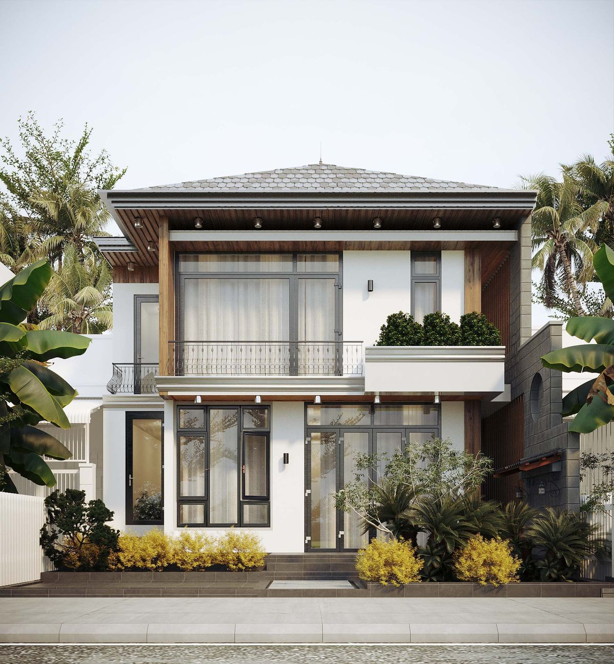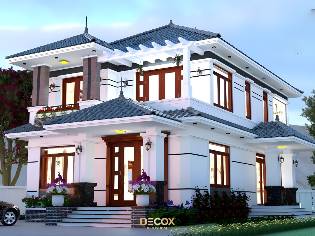 Biệt thự 2 tầng mái Nhật phong cách tân cổ điển là sự giao thoa tinh tế giữa vẻ đẹp sang trọng, chuẩn mực của cổ điển và tinh thần tối giản, thời thượng của kiến trúc. Hệ phào chỉ và cột trụ được chắt lọc vừa đủ, mềm mại và thanh thoát, tôn lên nét thanh lịch đầy khí chất. Dáng mái chữ A cân đối không chỉ tối ưu khả năng chống nóng, thoát nước mà còn khẳng định diện mạo bền vững theo thời gian. Không gian mở với cửa sổ, ban công và sân vườn được bố trí hài hòa, đưa thiên nhiên len lỏi vào từng góc sống, hoàn thiện một tổng thể tinh tế, đẳng cấp và khác biệt.