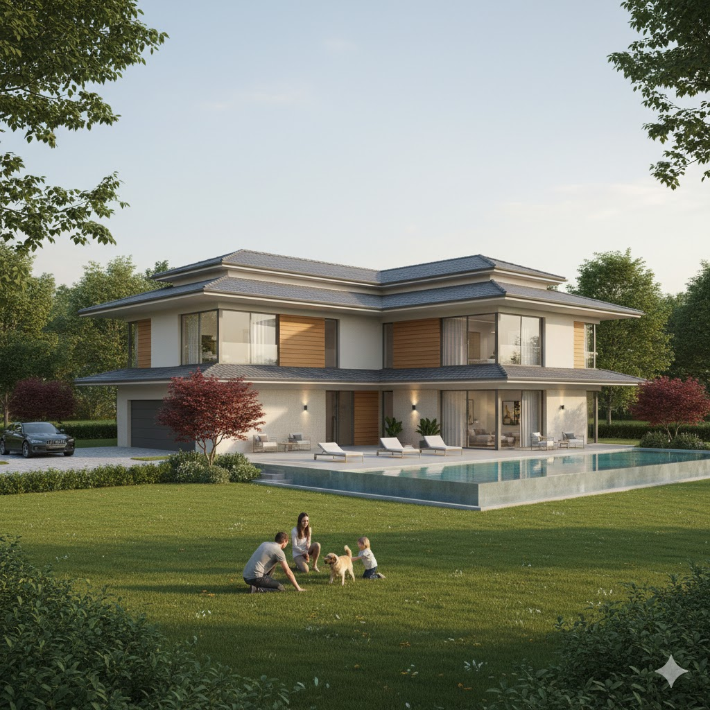 Nhà mái Nhật 2 tầng 5 phòng ngủ thường được xây trên quỹ đất rộng từ 250 - 400m², với diện tích xây dựng khoảng 180 - 250m². Dáng mái dốc nhẹ trải dài theo chiều ngang, kết hợp hiên rộng và ban công, tạo tổng thể bề thế nhưng thanh thoát. 5 phòng ngủ được bố trí tách khối, đảm bảo riêng tư cho từng thành viên, trong khi phòng khách, bếp và khu sinh hoạt chung chiếm trung tâm, kết nối mở ra sân vườn hoặc hiên ngoài trời. Thiết kế vừa tối ưu công năng, vừa đón ánh sáng và gió tự nhiên, kiến tạo không gian sống tiện nghi, hiện đại và gần gũi thiên nhiên.