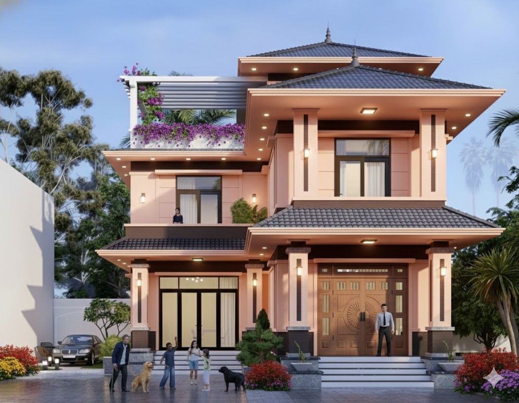 Nhà 2 tầng mái Nhật diện tích 100m² toát lên vẻ sang trọng nhưng gần gũi nhờ mặt bằng gọn gàng, bố cục tinh tế. Dáng mái dốc nhẹ trải ngang cân đối, kết hợp hiên và ban công vừa đủ, tạo cảm giác bề thế mà vẫn thanh thoát. Không gian sinh hoạt được sắp xếp mạch lạc, đón trọn ánh sáng và gió tự nhiên, mang đến trải nghiệm sống tiện nghi, thư thái và đậm chất premium ngay giữa tổ ấm.