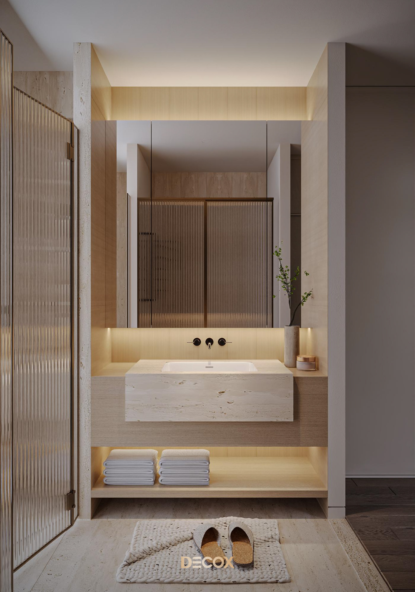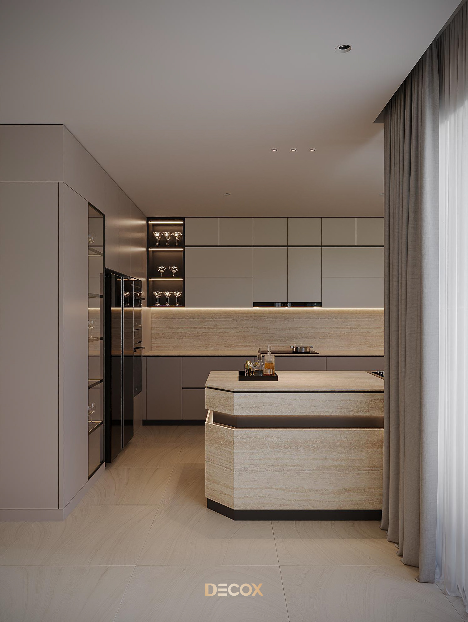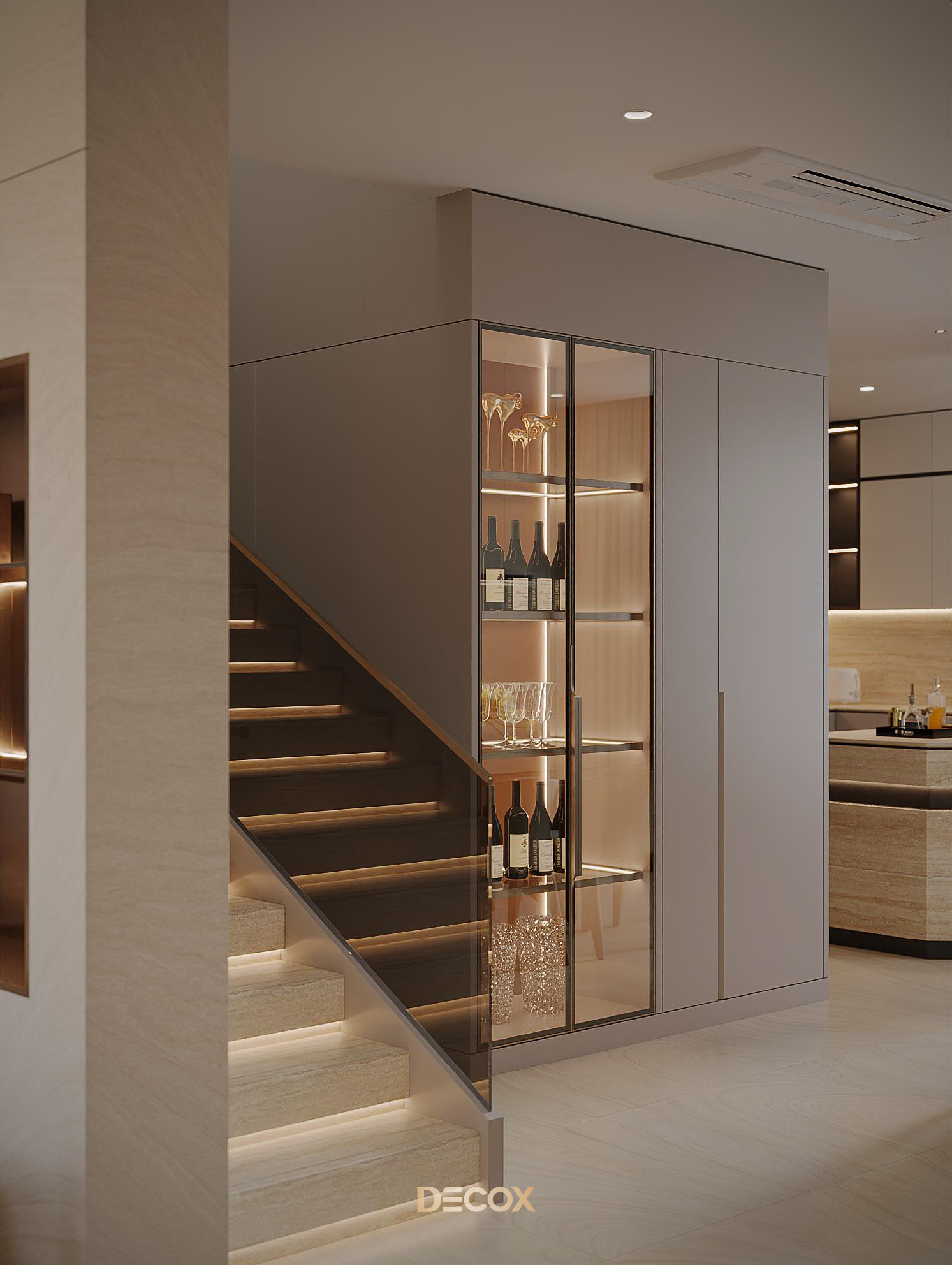 Sự kết hợp đá nhân tạo, gỗ, và kính cường lực màu trà trong công trình này tạo nên ngôn ngữ Modern Elegance: tinh tế, bền vững và dễ bảo trì.
