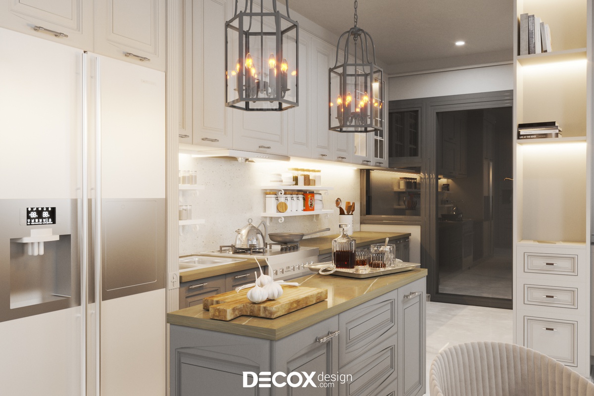 Một số gia chủ thường có suy nghĩ rằng nếu nhà bếp màu trắng thì sẽ rất khó để vệ sinh. Nhưng không thể phủ nhận rằng tông màu trắng sẽ giúp cho căn bếp của bạn trông luôn gọn gàng ngăn nắp và sạch sẽ. Do đó, để giúp cho nỗi lo căn bếp bị bám bẩn của gia chủ thì KTS của Decox cũng rất kỹ lưỡng trong việc lựa chọn vật liệu nhựa trắng giả gỗ, vừa giúp gia chủ dễ dàng trong việc lau chùi vừa giúp cho phòng bếp đẹp trở nên trang nhã hơn.