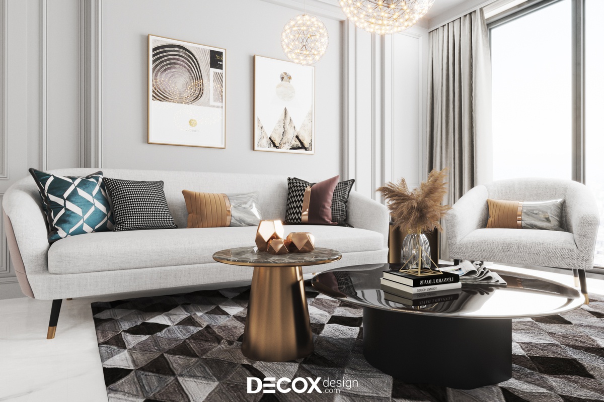 Tông màu trắng đã chẳng còn xa lạ gì trong phong cách bán cổ điển, đây là gam màu hoàn hảo để làm nền cho tất cả những yếu tố nội thất nổi bật, dù là chi tiết nhỏ nhất cũng có thể trở thành điểm nhấn bắt mắt. Ở đây KTS của Decox Design lựa chọn bộ sofa không quá lớn đi cùng một chiếc ghế đơn có dáng vẻ nhã nhặn, nhờ vào thảm lót sàn có họa tiết đậm màu nổi bật nên bộ sofa không hề bị chìm vào màu tường mà ngược lại càng khiến sofa trở nên mềm mại và phô dáng hơn.