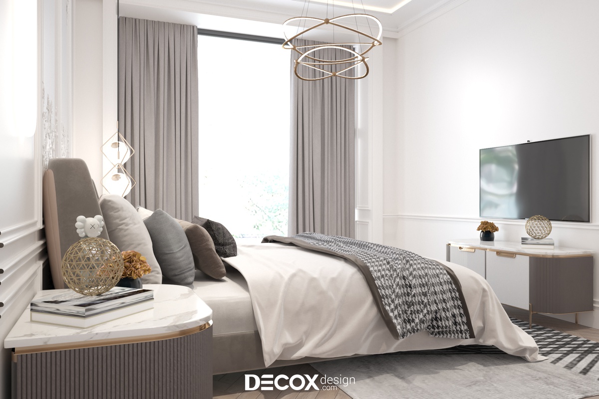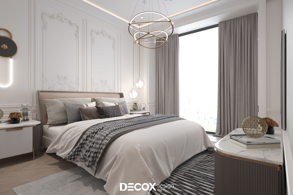 Khoa học đã chứng minh những gam màu trầm sẽ giúp cải thiện chất lượng của giấc ngủ, thế nên nơi phòng ngủ trong thiết kế nội thất căn hộ Empire City này đã dùng tông màu trầm hơn một chút so với phòng khách, cùng với đó là thiết kế hoa văn tường thể hiện sự cổ điển giúp phòng ngủ trở nên sang trọng hơn. Một điểm nhấn khác là chiếc đèn chùm có kiểu dáng đẹp mắt mang hơi hướng hiện đại giúp cung cấp ánh sáng cần thiết cho phòng ngủ.