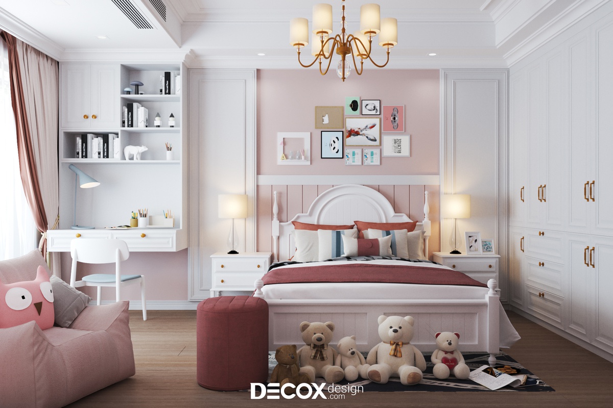 Phòng ngủ bé gái luôn phải tràn đầy những điều ngọt ngào và đáng yêu nhưng cũng đừng lo lắng rằng điều này sẽ phá hỏng tổng thể neo-classic của căn nhà. Chỉ cần lựa chọn một chiếc giường và những chiếc đèn có hình dáng cổ điển thì cả căn phòng dù cho có mang tông màu ngọt ngào cũng vẫn không đánh mất đi sự sang trọng của phong cách.