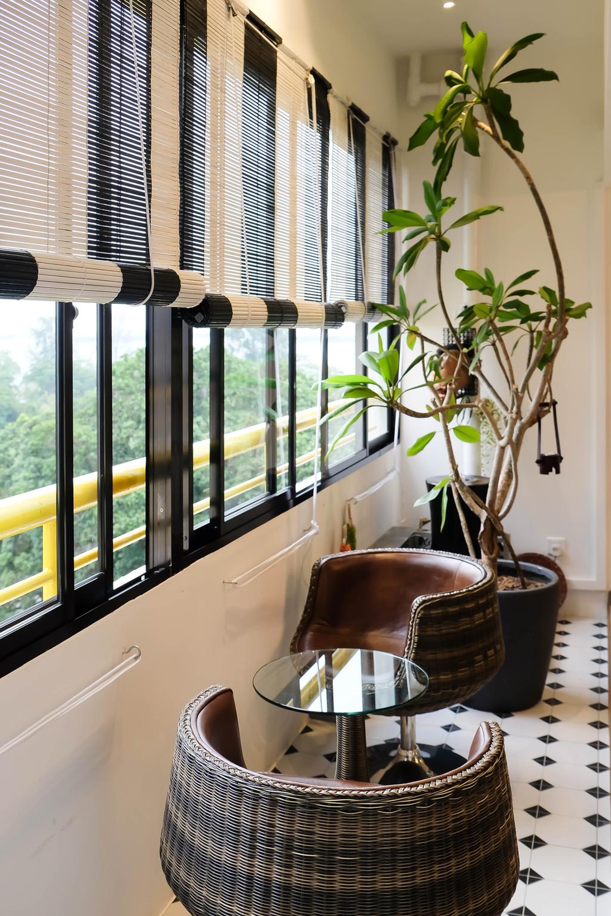 Gạch giả gỗ là một trong những sự lựa chọn được yêu thích nhất hiện nay. Trong thiết kế này, gạch lát sàn ban công được chọn có màu gỗ sáng nổi bật, mang một phần nào đó phong cách retro hoài cổ.
