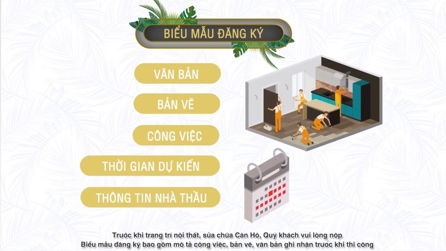 Trước khi thiết kế nội thất hay sửa chữa căn hộ, quý khách vui lòng nộp biểu mẫu đăng ký bao gồm bảng mô tả công việc, bản vẽ, văn bản giấy tờ trước khi thi công cùng với sự giám sát của nhân viên kỹ thuật tòa nhà, thời gian dự kiến nghiệm thu và thông tin của các nhà thầu.