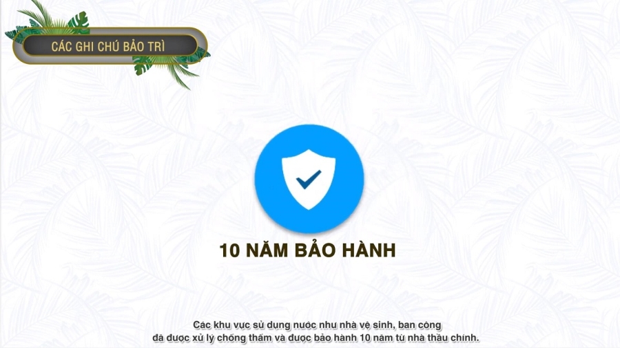 Các khu vực sử dụng nước như ở khu vực WC, ban công sẽ được xử lý chống thấm và bảo hành 10 năm từ nhà thầu chính.