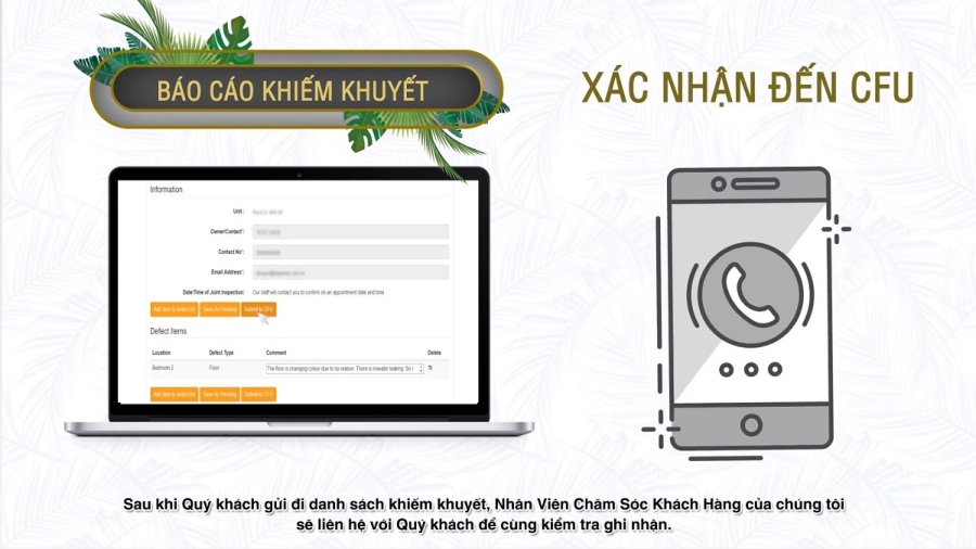 Khi có các khiếm khuyết gì về vấn đề căn hộ, quý khách hãy thông báo đến hệ thống dịch vụ khách hàng online để được giải đáp thắc mắc. Sau khi gửi bảng khiếm khuyết, nhân viên CSKH sẽ liên hệ ngay với khách hàng để giải quyết.