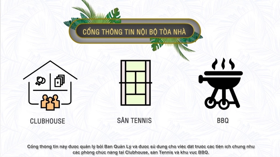 Cổng thông tin này được quản lý và được sử dụng cho việc đặt lịch trước các dịch vụ tiện ích chung như các phòng chức năng tại Clubhouse, sân tennis và khu vực BBQ.