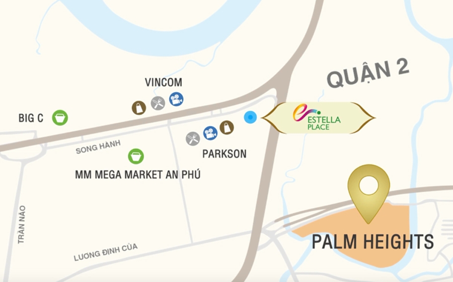 Bao quanh Palm Heights là các dịch vụ tiện ích như siêu thị Mega Market, trung tâm thương mại Estella Place, các rạp chiếu phim và các địa điểm ăn uống, vui chơi tại khu vực Thảo Điền.