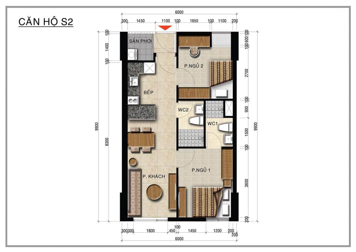 Mặt bằng căn hộ Căn hộ S2 - Diện tích 55m2