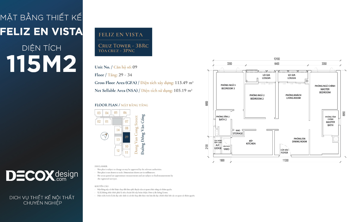 Mặt bằng thiết kế căn hộ chung cư Feliz En Vista tòa Cruz 3 phòng ngủ 115m2