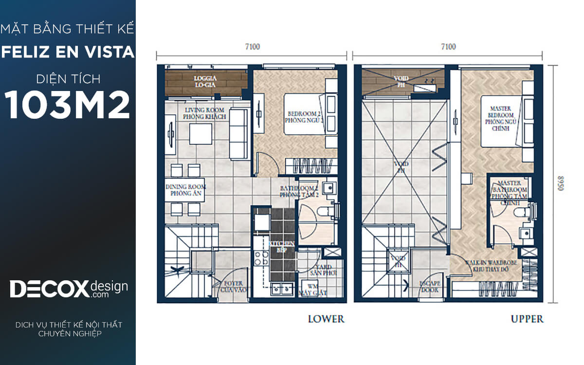 – 2 phòng ngủ: 103m2 là căn hộ thông tầng, chiều cao khoảng không là 5.85m và có của chính cho cả 2 tầng.