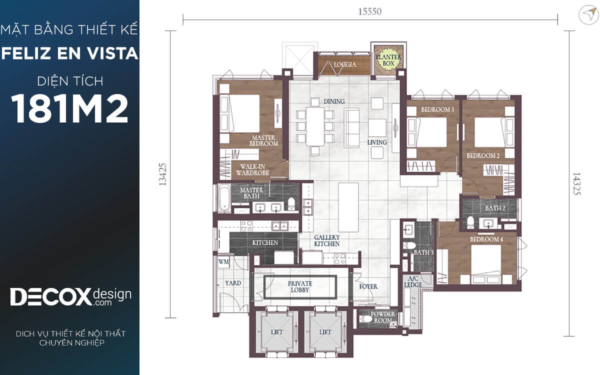 Mặt bằng thiết kế căn hộ chung cư Feliz En Vista tòa Atlaz 4 phòng ngủ 181m2