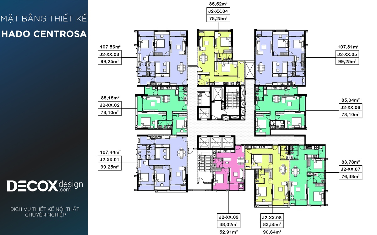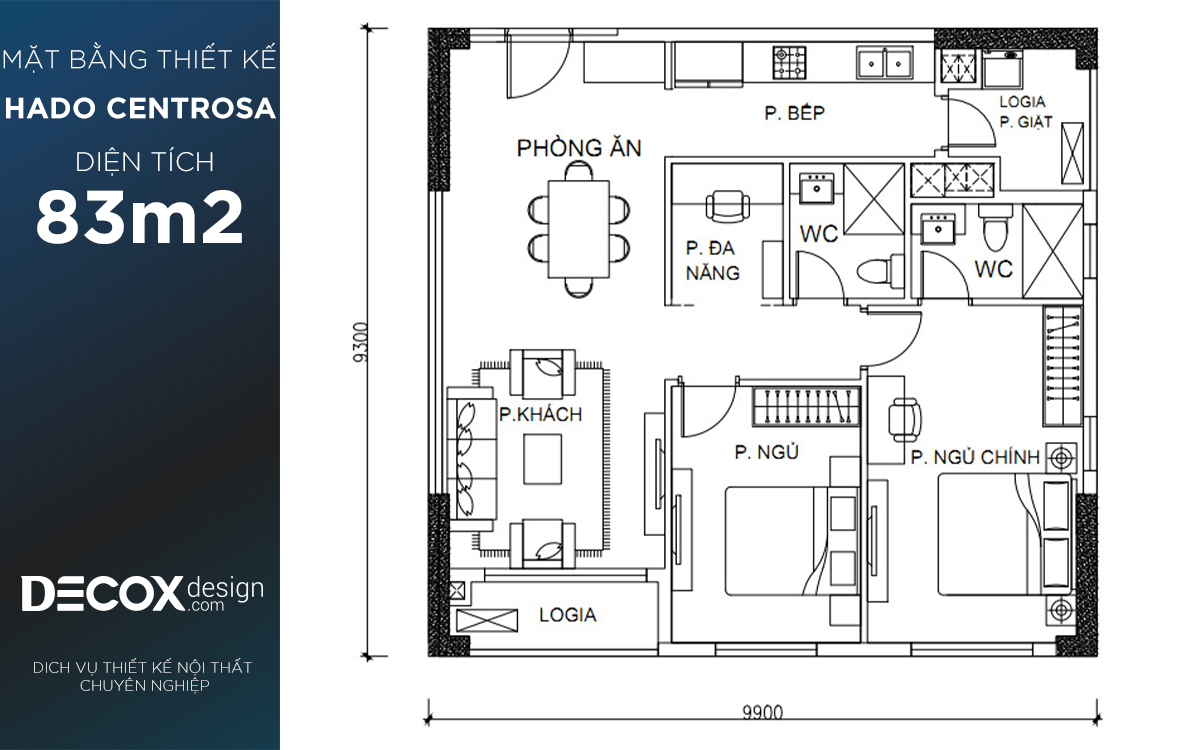Mặt bằng căn hộ chung cư Hado Centrosa 83.09m2, 2 phòng ngủ