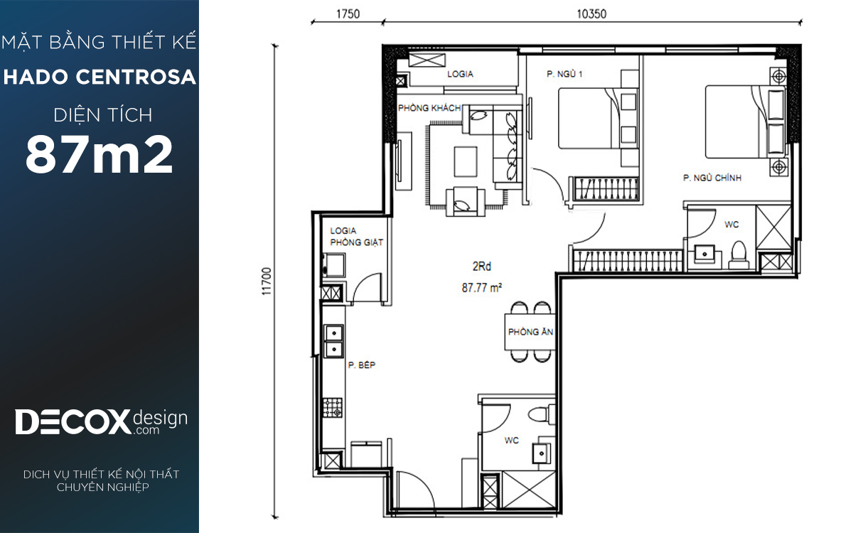 Mặt bằng căn hộ chung cư Hado Centrosa 87.77m2, 2 phòng ngủ