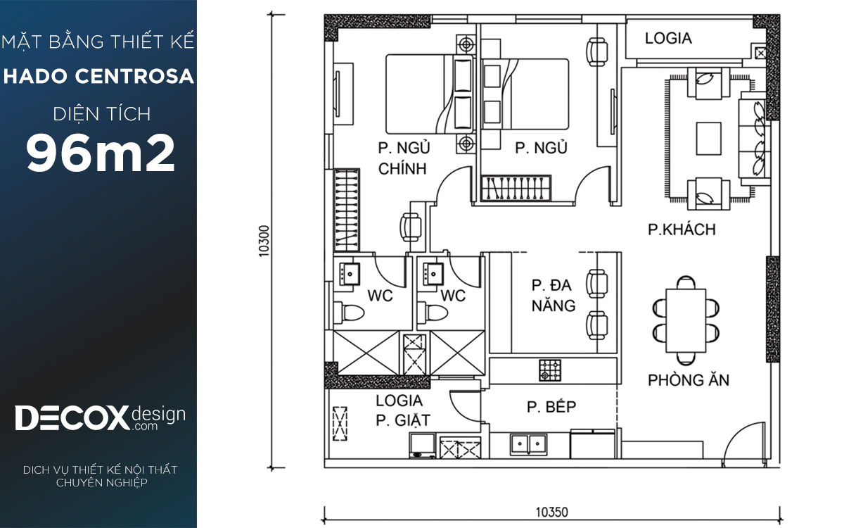Mặt bằng căn hộ chung cư Hado Centrosa 96.54m2, 2 phòng ngủ + 1 phòng đa năng
