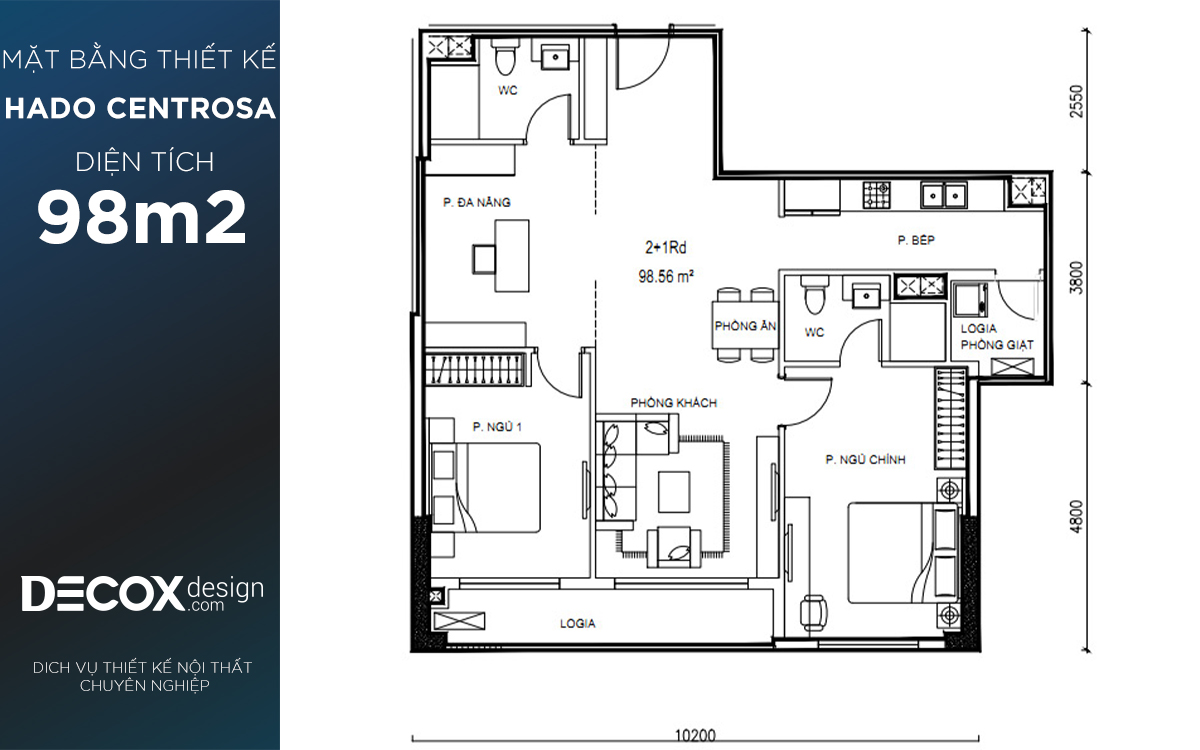 Mặt bằng căn hộ chung cư Hado Centrosa 98.56m2, 2 phòng ngủ + 1 phòng đa năng