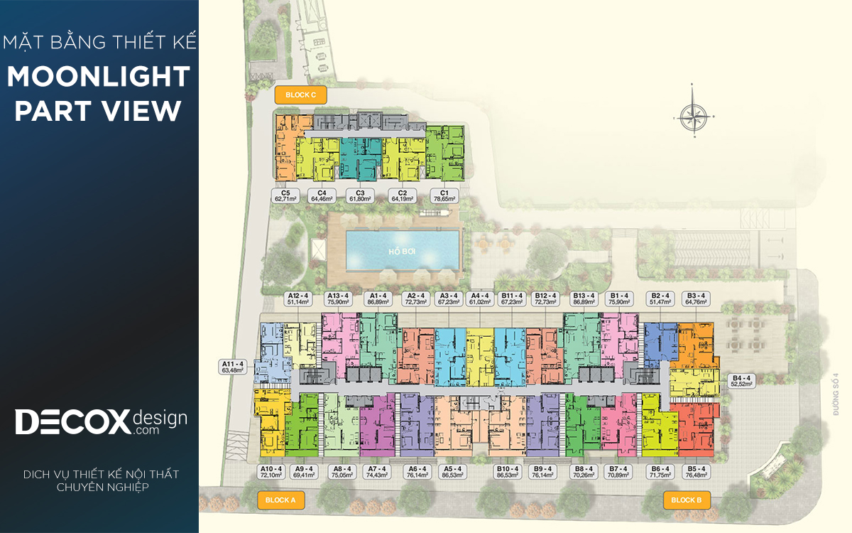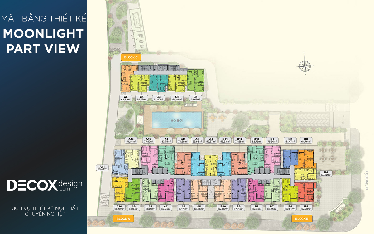 Mật độ căn hộ ở Block A là 13 căn hộ/ tầng được đánh số từ A1 đến A13, quy mô từng căn dao động từ 1 đến 3 phòng ngủ.