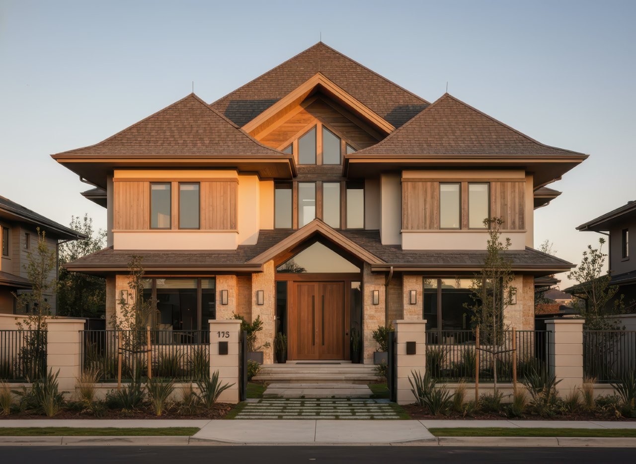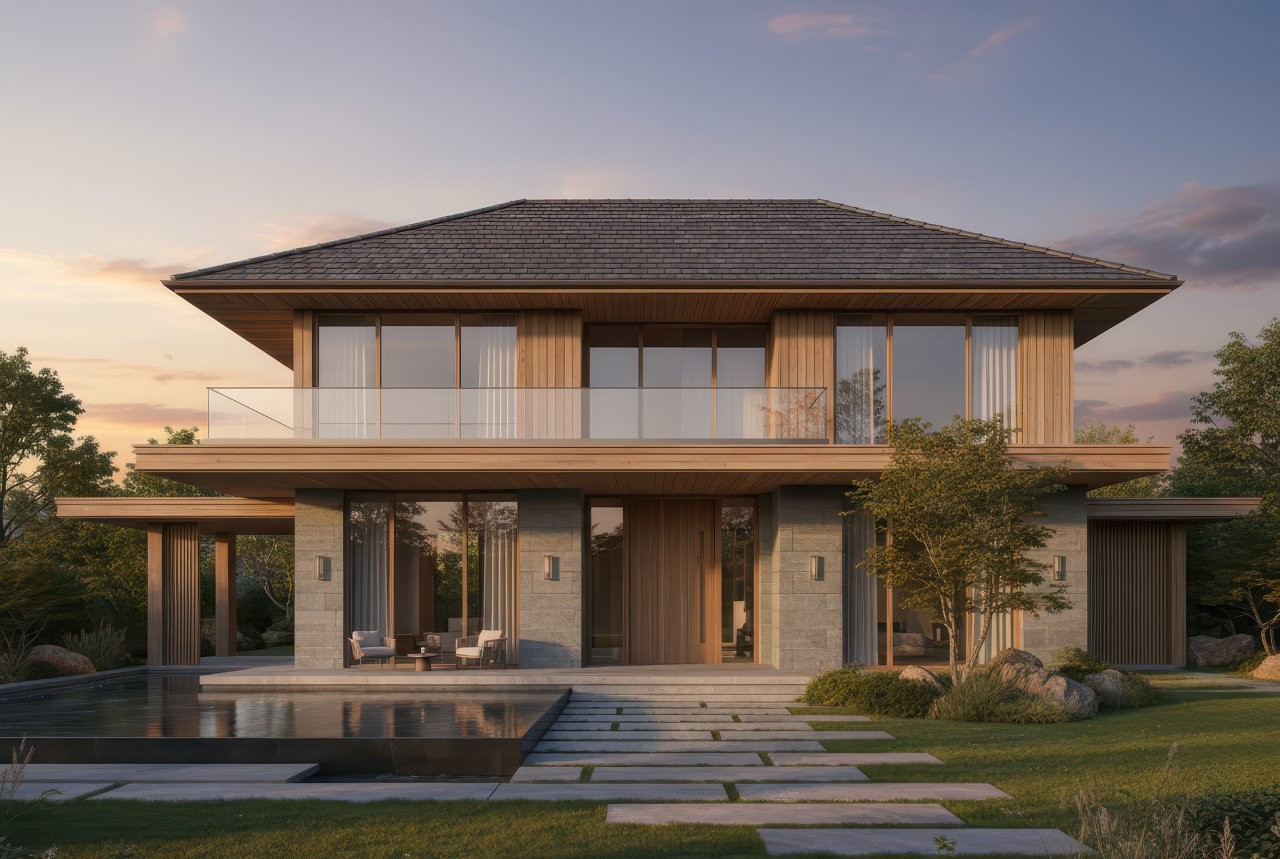 Biệt thự 2 tầng mái Nhật có sân vườn gây ấn tượng với hệ mái dốc nhẹ, khoảng 20 - 30 độ và được thiết kế thành nhiều lớp lớn nhỏ xếp chồng. Màu sắc chủ đạo của biệt thự thường là những gam trung tính như trắng sứ, xám ghi và gỗ mộc - khi kết hợp với sắc xanh của cây cối sẽ tạo nên tổng thể dịu mắt và sang trọng. Cấu trúc này tạo cảm giác vững chãi đồng thời mang lại bóng mát dịu nhẹ, khiến không gian sân vườn thoáng mát và dễ chịu hơn. Các lớp mái xếp tầng không chỉ tạo nên vẻ đẹp thanh lịch mà còn giúp thoát nước tốt và chống nóng hiệu quả, phù hợp với khí hậu nhiệt đới ẩm tại Việt Nam.