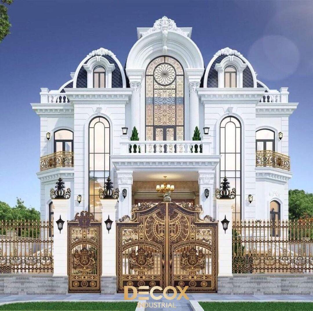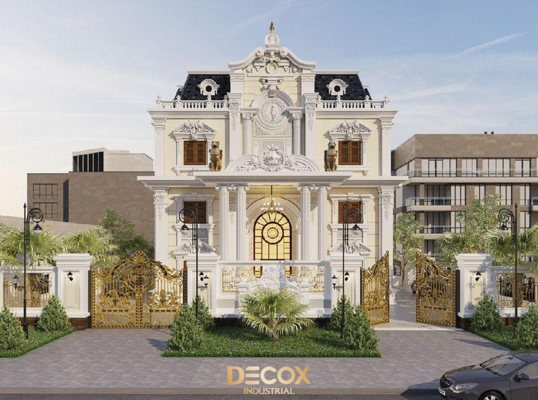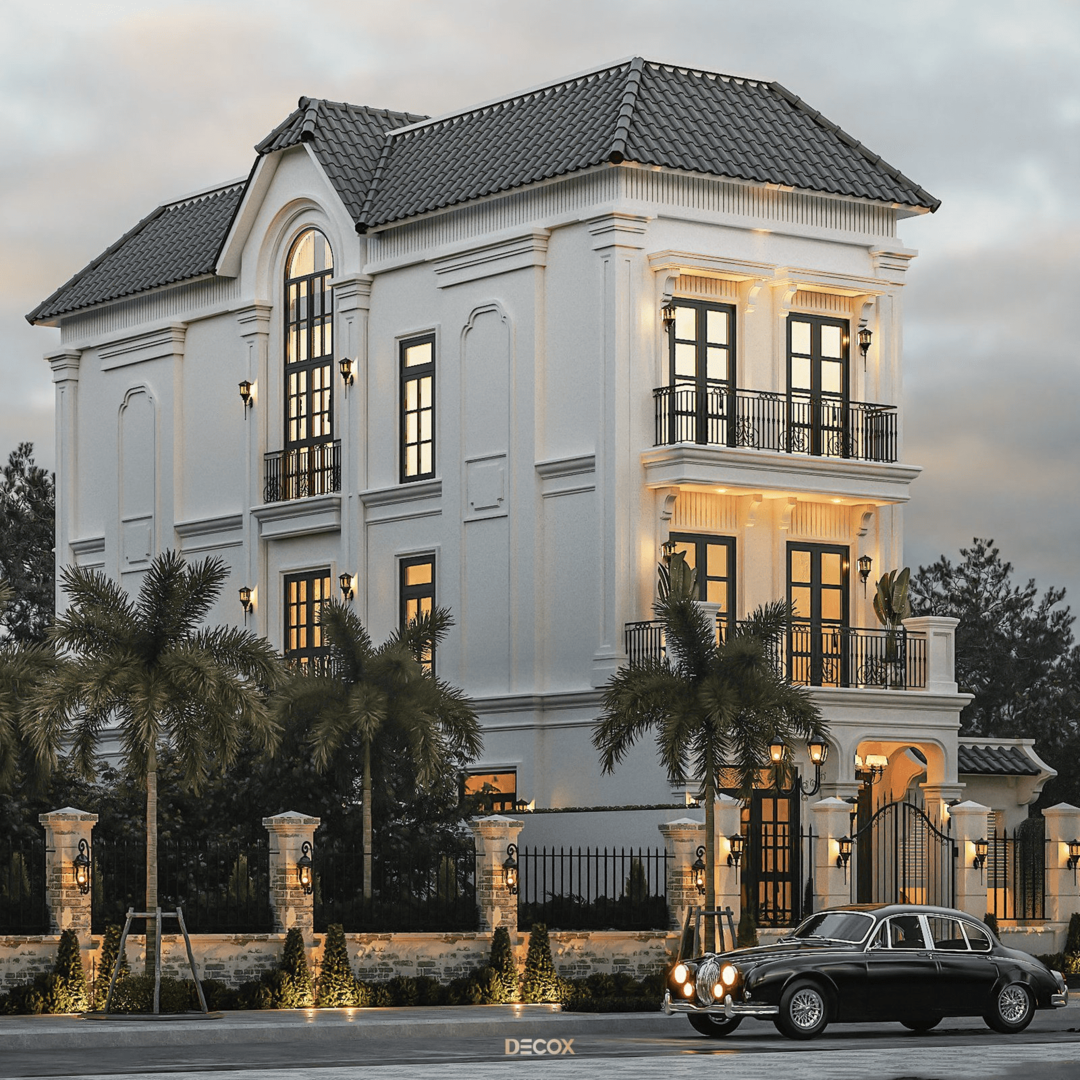 Biệt thự Tân cổ điển kiểu Pháp nổi bật với mặt tiền đăng đối, cân bằng hoàn hảo và các chi tiết trang trí cầu kỳ nhưng tinh tế. Điểm nhấn đặc trưng là mái mansard, các cột trụ Corinthian hoặc Ionic, phào chỉ, phù điêu và lan can hoa văn sắt uốn cong tinh xảo, tạo vẻ đẹp thanh lịch và quý phái. Cửa sổ cao, đối xứng, thường kết hợp mái vòm hoặc khung kính lớn, giúp không gian nội thất luôn tràn ngập ánh sáng tự nhiên.