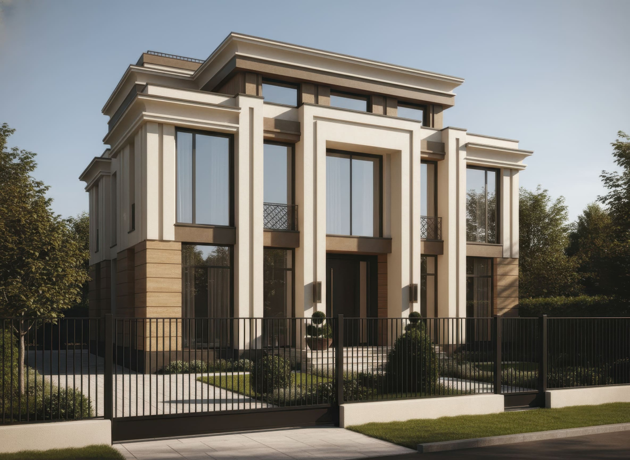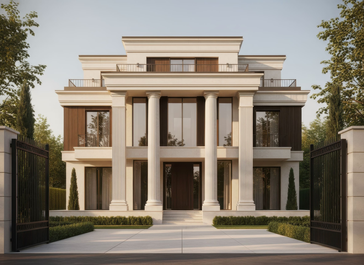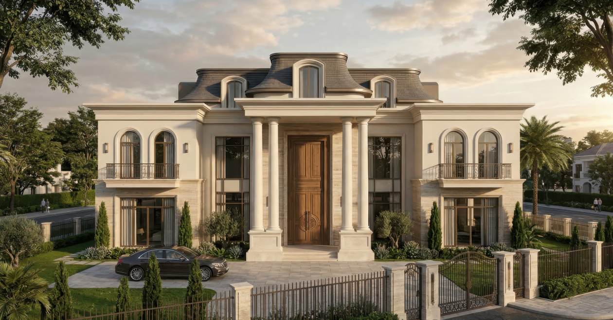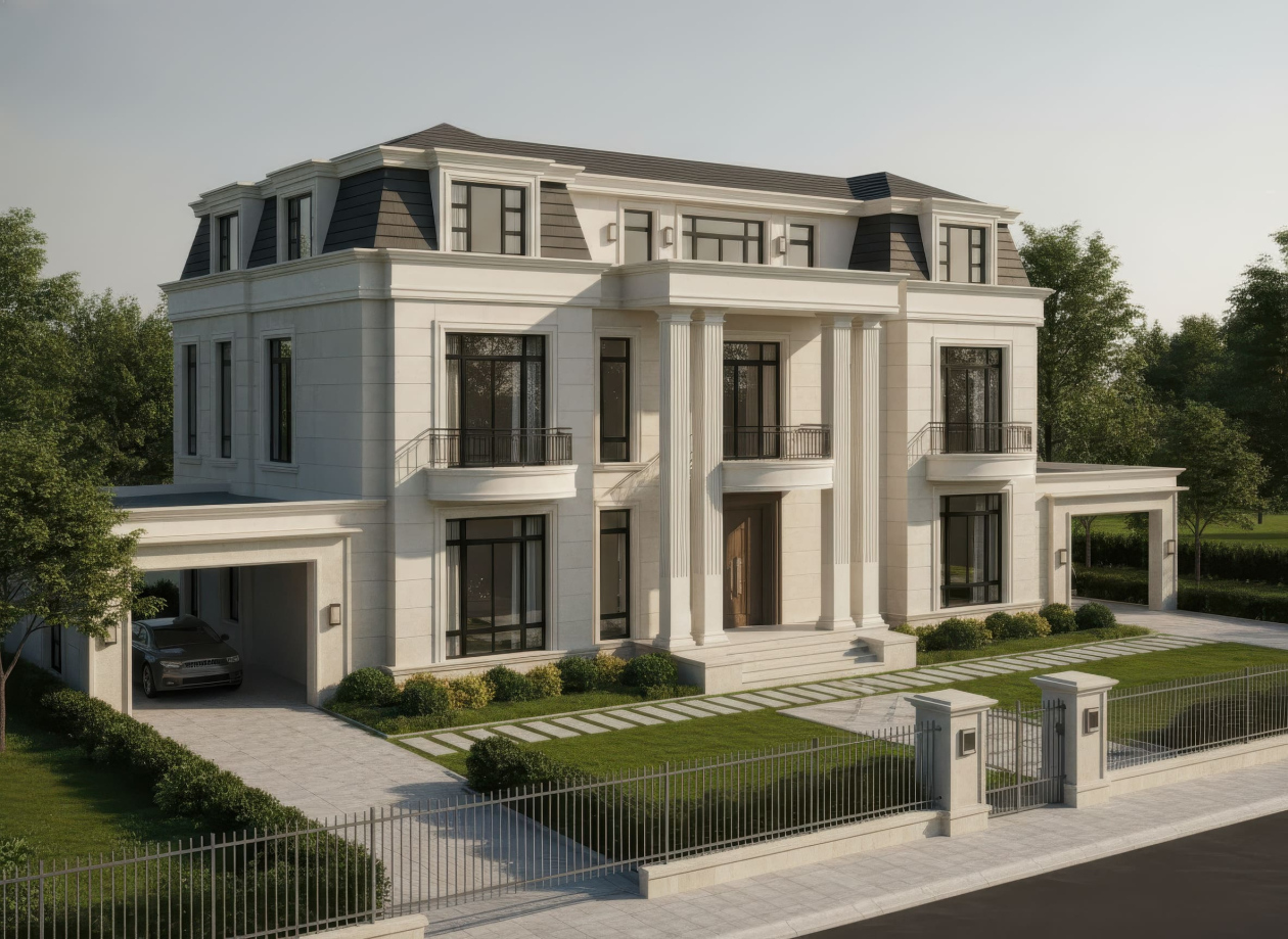 Biệt thự Tân cổ điển kiểu Pháp nổi bật với mặt tiền đăng đối, cân bằng hoàn hảo và các chi tiết trang trí cầu kỳ nhưng tinh tế. Điểm nhấn đặc trưng là mái mansard, các cột trụ Corinthian hoặc Ionic, phào chỉ, phù điêu và lan can hoa văn sắt uốn cong tinh xảo, tạo vẻ đẹp thanh lịch và quý phái. Cửa sổ cao, đối xứng, thường kết hợp mái vòm hoặc khung kính lớn, giúp không gian nội thất luôn tràn ngập ánh sáng tự nhiên.