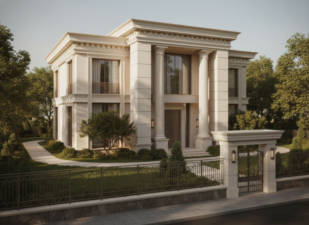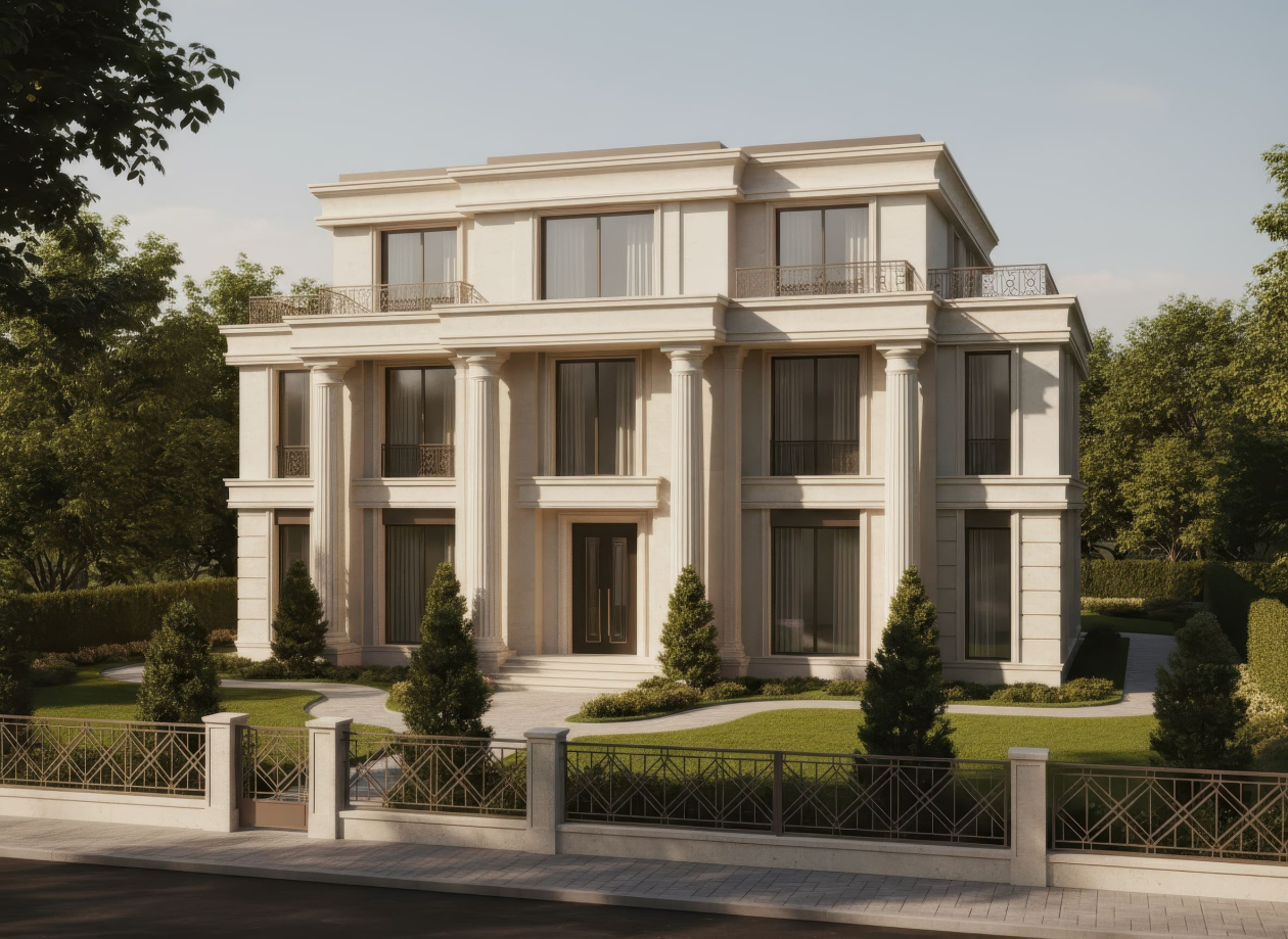 Biệt thự Tân cổ điển nổi bật với những đặc trưng dễ nhận diện, mang đến vẻ đẹp hài hòa và tinh tế:
