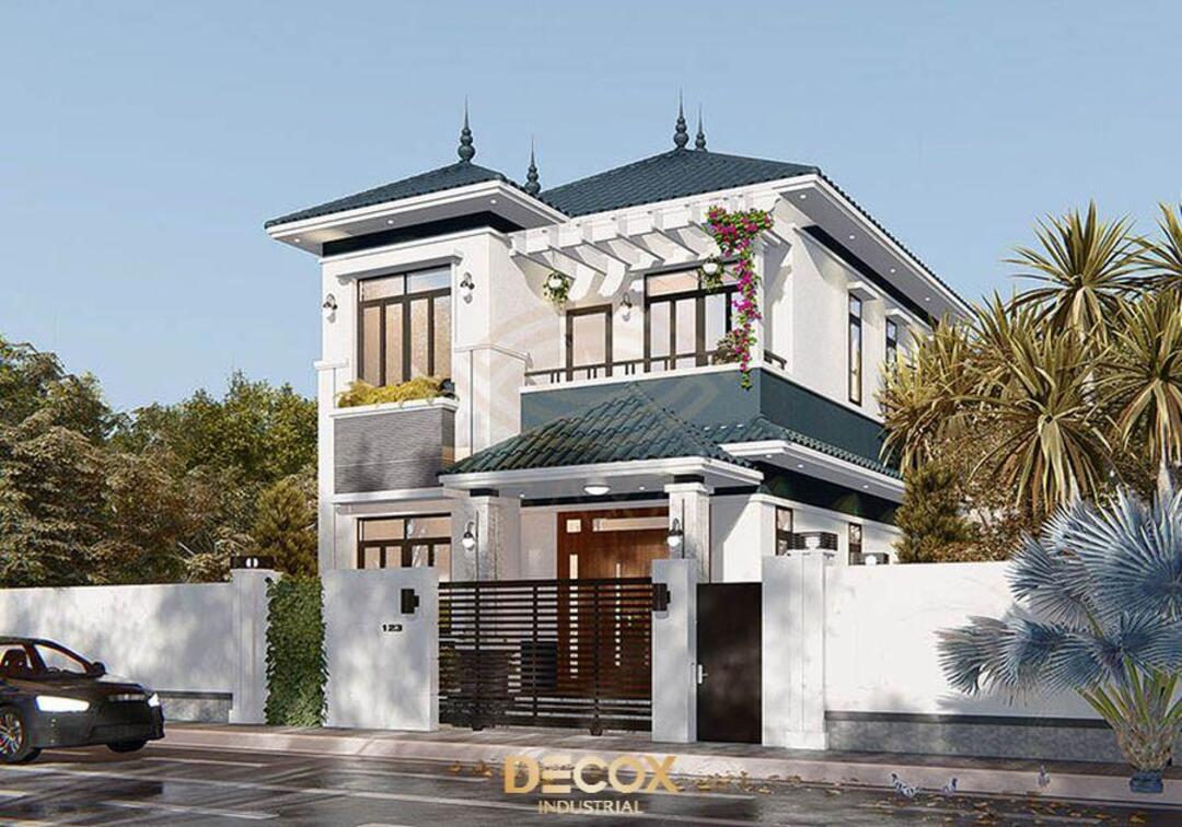 Dáng mái Nhật đua nhẹ ra ngoài tạo bóng mát tự nhiên, giúp biệt thự 2 tầng Tân cổ điển vừa thẩm mỹ vừa cải thiện hiệu quả che nắng và thông gió