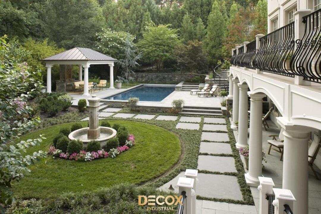 Biệt thự sân vườn Tân cổ điển chú trọng bố trí các lối đi lát đá, hành lang xanh và bồn hoa, tạo nhịp điệu mềm mại và hài hòa giữa kiến trúc và thiên nhiên