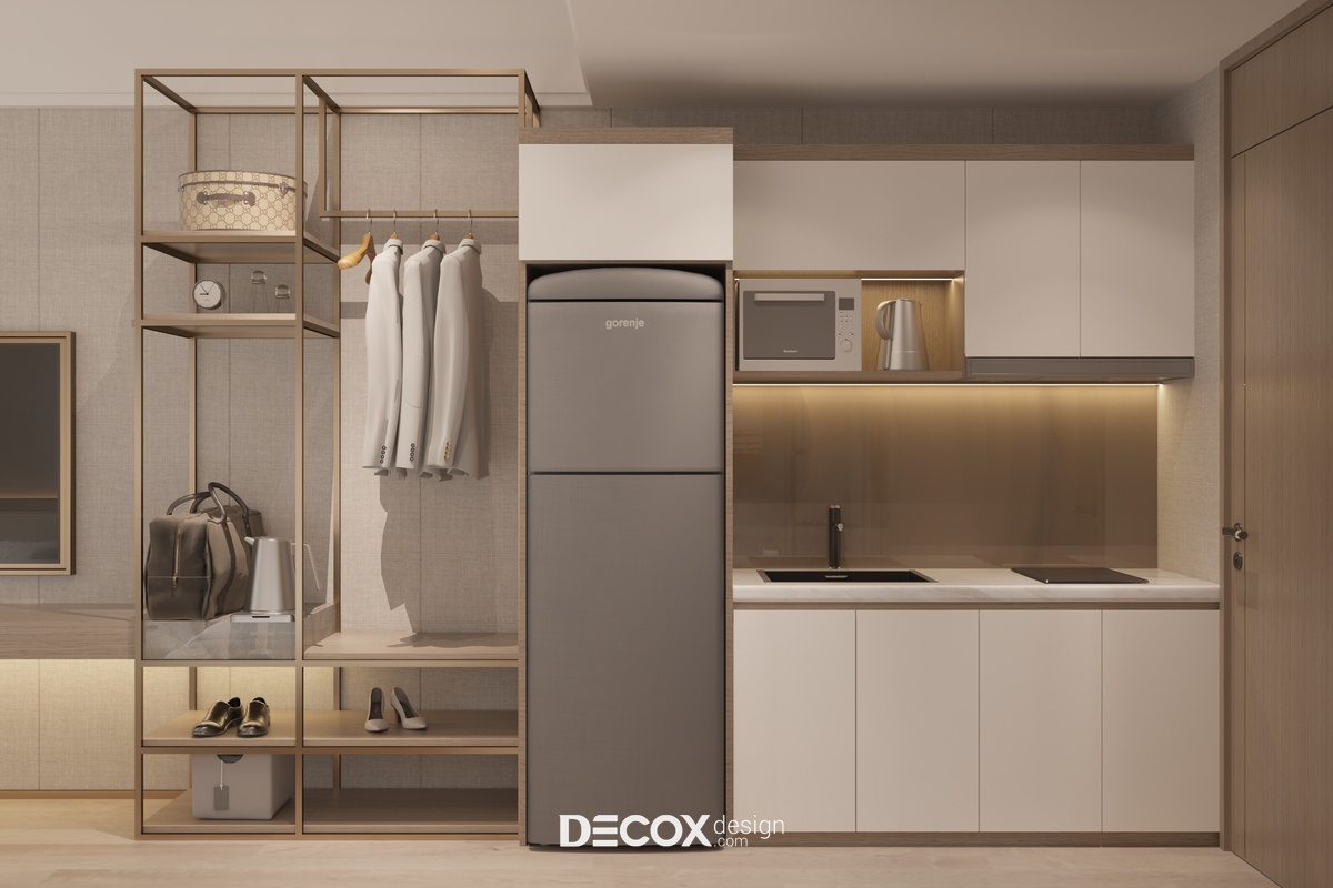Khu vực bếp nấu được thiết kế theo dạng chữ I đặt sát khu vực cửa ra vào, ngoài những nội thất cơ bản KTS còn bố trí thêm đồng thời cả hệ tủ bếp trên lẫn dưới nhằm làm tăng không gian lưu trữ để căn bếp luôn gọn gàng. Kế bên khu vực bếp là một kệ treo quần áo nhỏ được làm từ chất liệu gỗ mộc mạc được phân chia thành nhiều ngăn với kích cỡ khác nhau vừa có thể treo những bộ quần áo đã ủi phẳng phiu hoặc lưu trữ giày dép, túi xách tùy theo nhu cầu của người sử dụng.