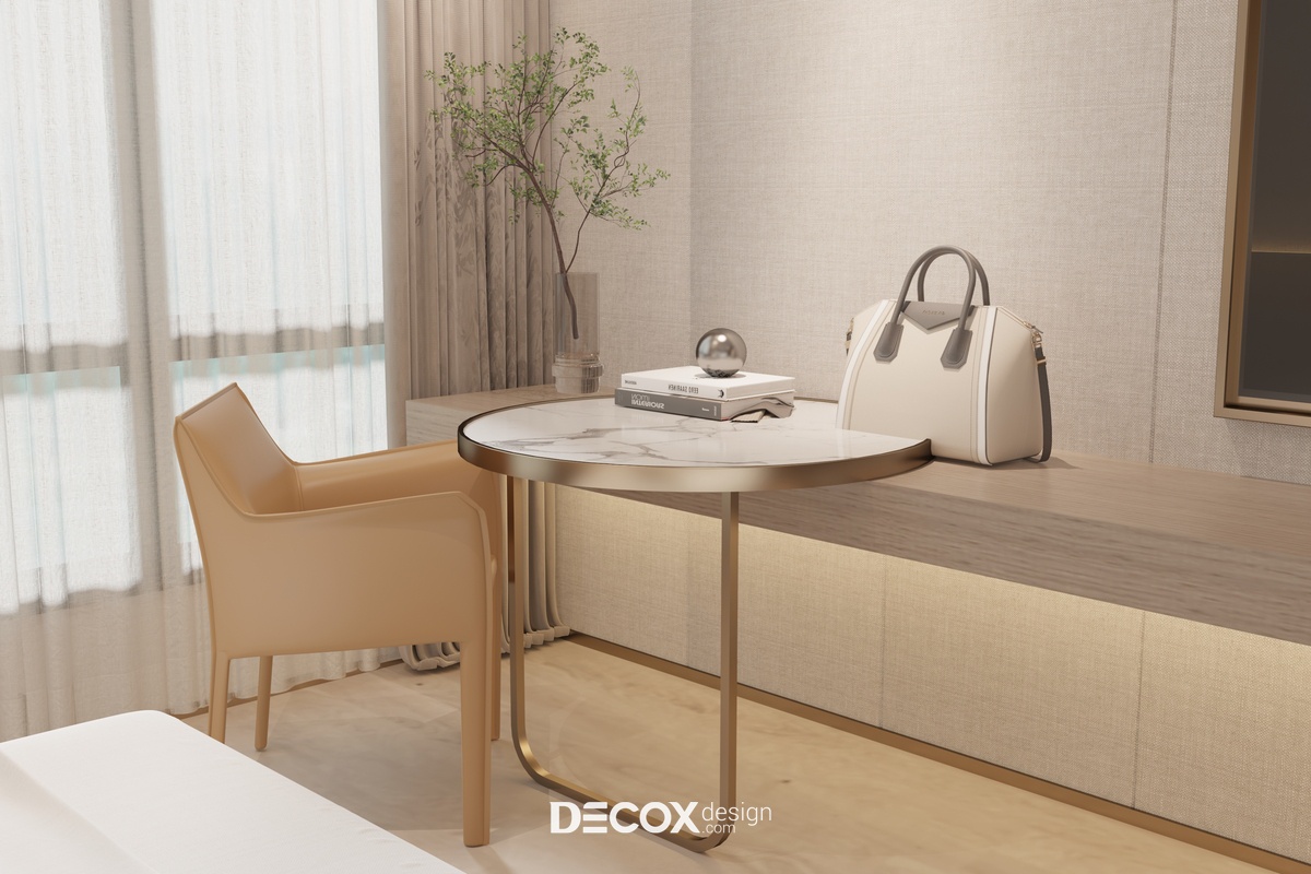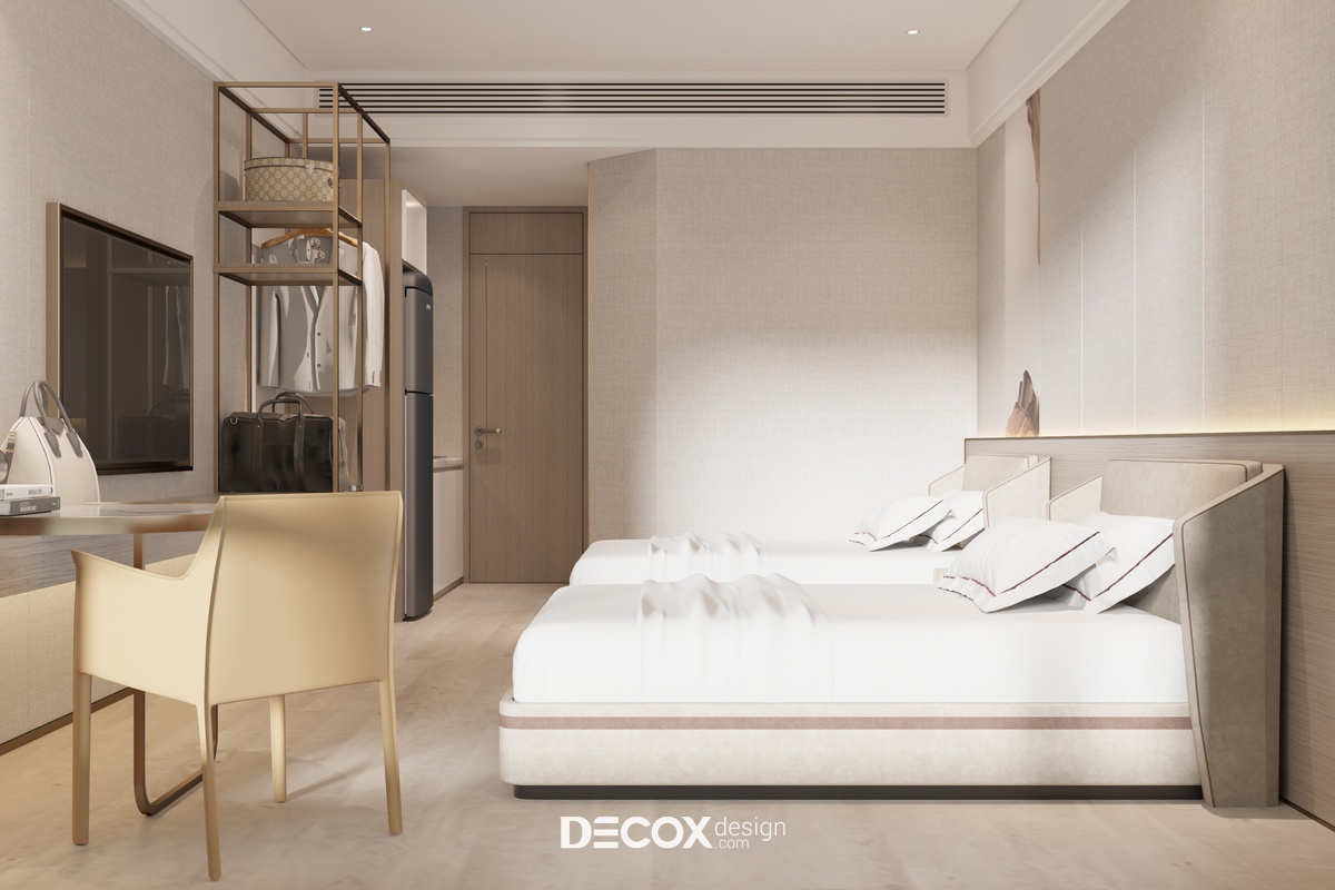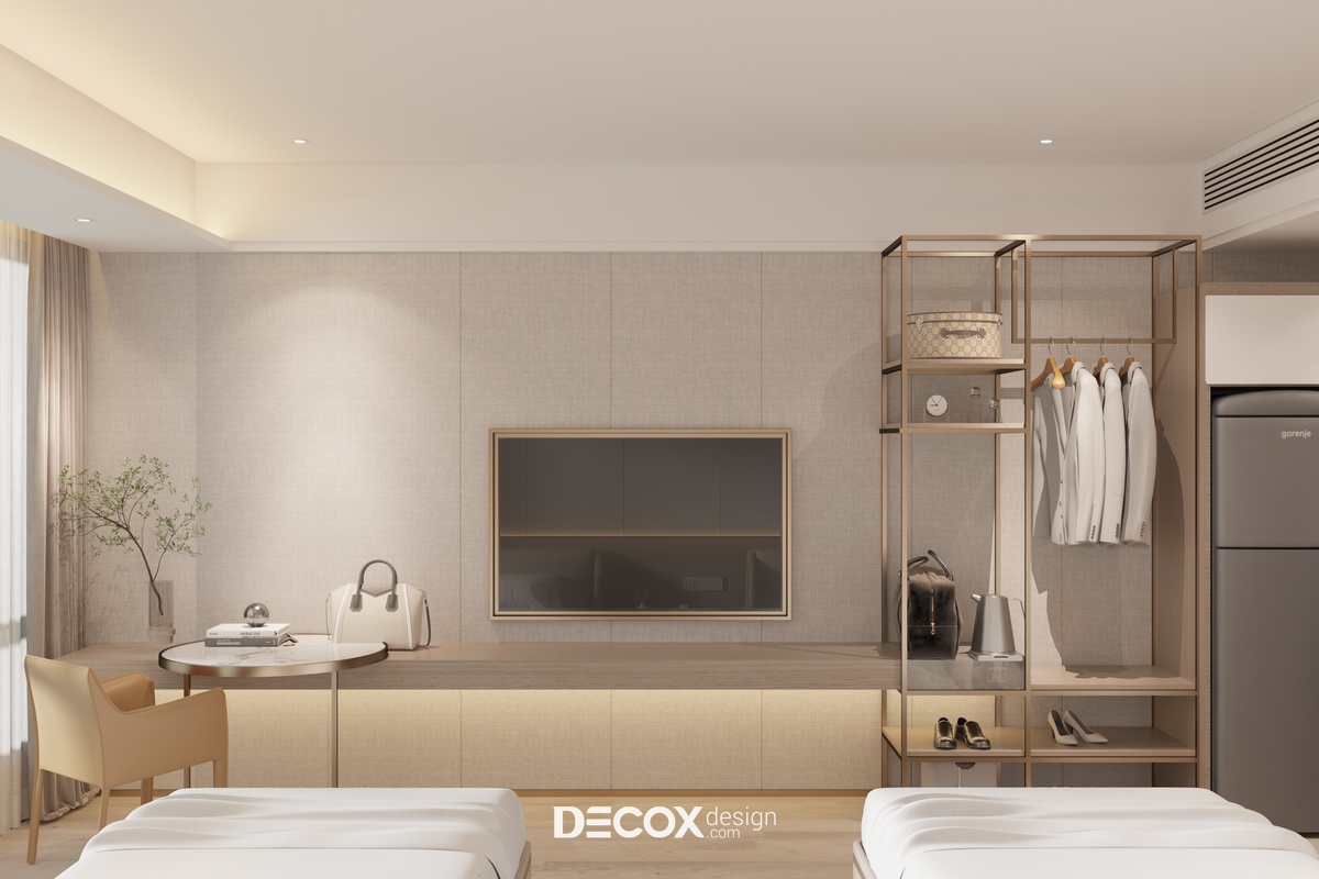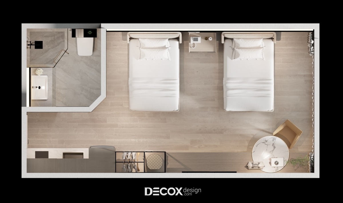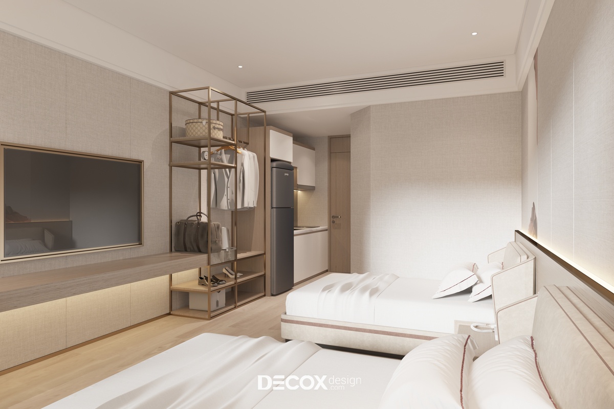 Căn hộ dịch vụ (Serviced Apartment) được thiết kế nội thất theo phong cách hiện đại sử dụng tông màu sáng chủ đạo. Phòng được trang bị nội thất bao gồm 2 giường ngủ, 1 bếp, 1 wc và các vật dụng tiện nghi cơ bản cho cuộc sống của 2 người trẻ tại thành phố. Với diện tích chỉ vỏn vẹn 28m2 nên Decox Design đã áp dụng lối thiết kế mở cho toàn bộ không gian nhằm tối ưu hóa diện tích cũng như tạo sự thông thoáng, rộng rãi hơn cho người sử dụng. Ngoài ra, do nhu cầu sử dụng chủ yếu cho việc sinh hoạt, ăn uống và nghỉ ngơi nên căn hộ không bố trí khu vực phòng khách thay vào đó là một bộ bàn ghế nhỏ cạnh cửa sổ để người sử dụng có thể linh hoạt sử dụng thành nơi làm việc hay nơi để "chill" cùng những tách cafe và ngắm nhìn quang cảnh thành phố bên ngoài.