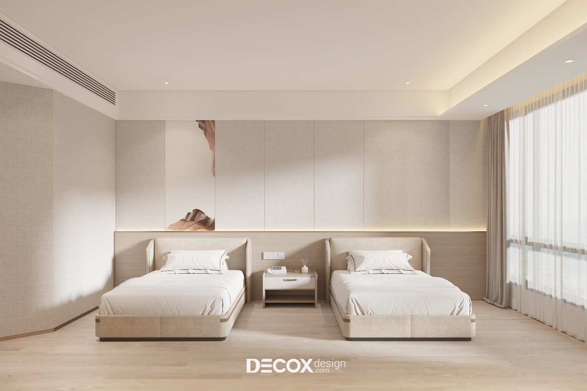 khu vực nghỉ ngơi được trang bị 2 giường đơn liền kề nhau với kích thước giường thuộc chuẩn "khách sạn". Ở đây KTS đã áp dụng lối bố trí, thiết kế nội thất tối giản nhằm tiết kiệm diện tích, tạo không gian rộng rãi và hướng đến giá trị tinh thần giúp người dùng có thể tập trung vào việc nghỉ ngơi nhiều hơn cũng như cải thiện giấc ngủ tốt hơn.
