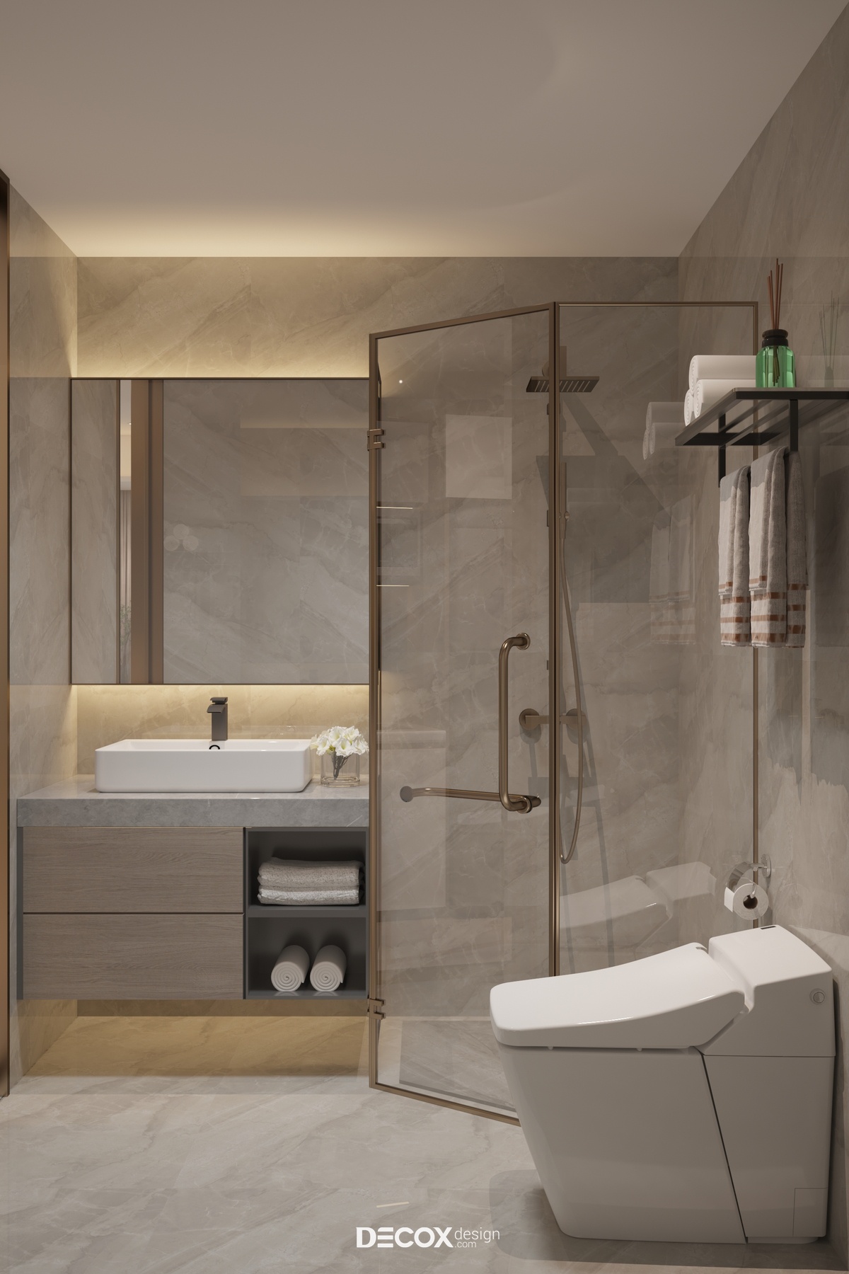 Phòng WC trong căn hộ Serviced Apartment được ốp gạch giả đá vân mây từ tường đến sàn với tone màu trung tính chủ đạo kết hợp thêm hệ đèn led vàng vừa sang trọng vừa tạo cảm giác dễ chịu, thư thái cho người sử dụng. WC được phân chia thành 2 khu vực khô - nước riêng biệt với thiết kế buồng tắm đứng bằng kính sang trọng.