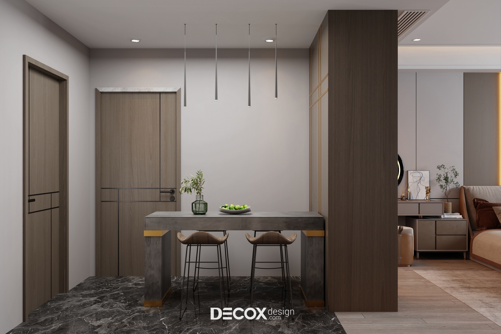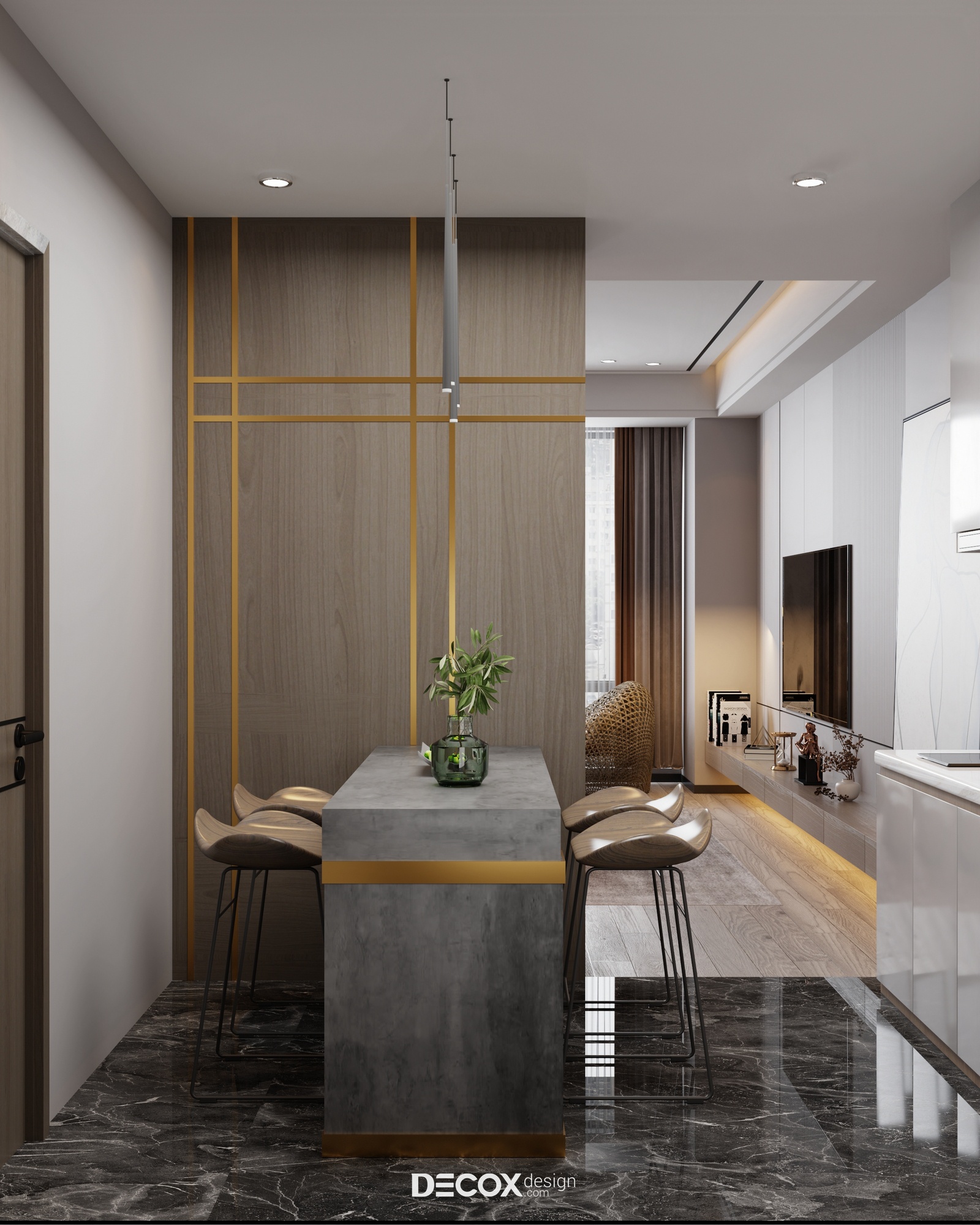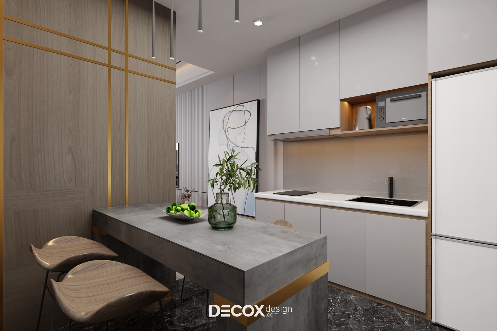 Thiết kế mở giữa khu vực phòng ngủ và phòng bếp giúp ánh sáng và không khí dễ dàng lưu chuyển xuyên suốt các khu vực bên trong căn hộ dịch vụ. Ở đây, bạn có thể nhận thấy sự khác biệt trong việc lựa chọn chất liệu lát sàn. Thay vì ốp gỗ như phòng ngủ, KTS lại lựa chọn chất liệu đá marble đen sang trọng lát sàn nhằm tạo sự mới mẻ cũng như khẳng định ngầm chức năng của từng khu vực. Bếp dạng chữ I gam màu xám đồng bộ với màu sắc chủ đạo và được trang bị đồng thời cả hệ tủ bếp trên lẫn hệ tủ bếp dưới giúp khách hàng có thêm nhiều không gian lưu trữ đồ đạc. Đối diện khu bếp là khu vực phòng ăn được thiết kế như dạng quầy bar nhỏ, bàn ăn ghi điểm ấn tượng với chất liệu xi măng kẻ chỉ mạ vàng đơn giản mà sang trọng.