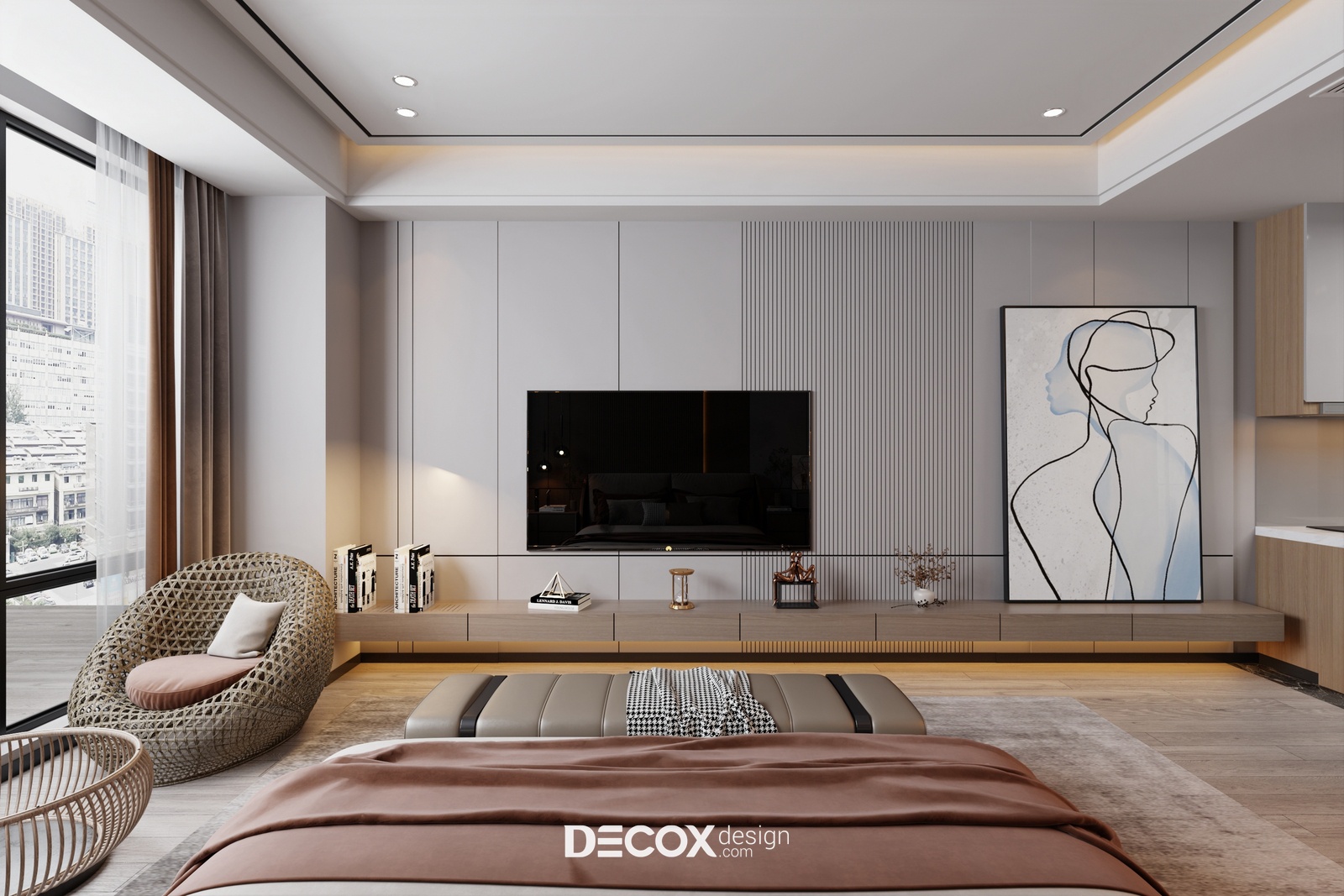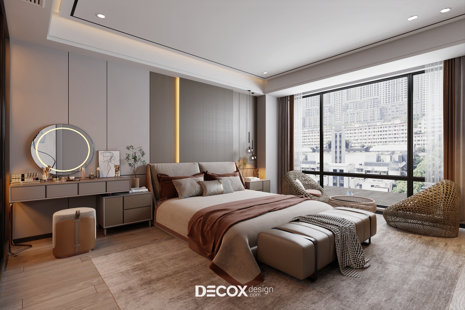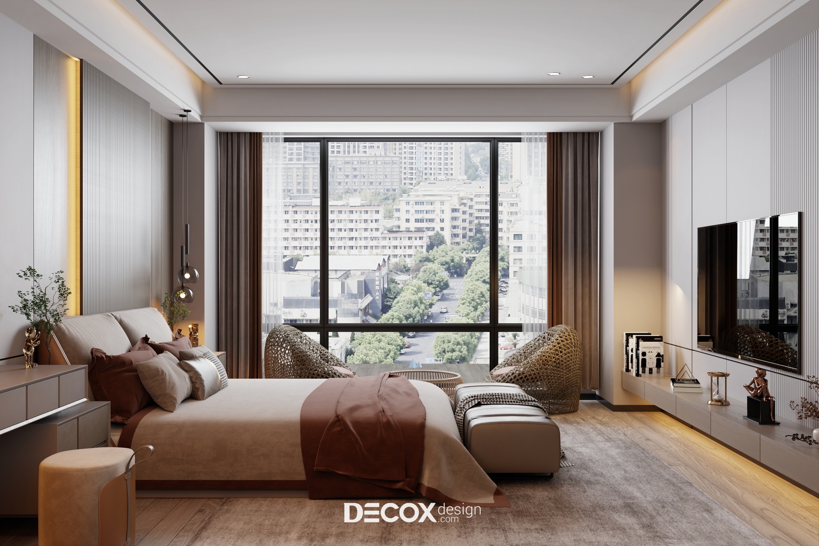 Phần lớn diện tích bên trong căn hộ được phân bổ dành cho khu vực phòng ngủ - chức năng chính của loại hình Serviced Apartment. Ngoài tone màu trung tính chủ đạo trên trần, tường và đồ nội thất KTS cũng kết hợp thêm chất liệu gỗ làm điểm nhấn trên tường và ốp sàn nhằm mang đến một không gian ấm cúng, mang lại sự thư giãn cao cho người sử dụng. Điểm nhấn đặc sắc trong không gian này phải kể đến vách lam gỗ ốp tường đầu giường được trang bị đèn led hắt đầy ấn tượng. Khu vực tiếp khách được tích hợp ngay bên trong không gian phòng ngủ đem đến hiệu quả thẩm mỹ lẫn công năng cao. Thay vì những bộ sofa chiếm khá nhiều diện tích KTS đã lựa chọn sử dụng hai chiếc ghế armchair nhỏ gọn được đan lát từ chất liệu mây tre kết hợp cùng một chiếc bàn trà đồng bộ và đặt chúng cạnh cửa sổ để khách hàng có thể vừa thưởng thức những tách trà nóng vừa chiêm ngưỡng quang cảnh thành phố tấp nập bên ngoài khung cửa kính.