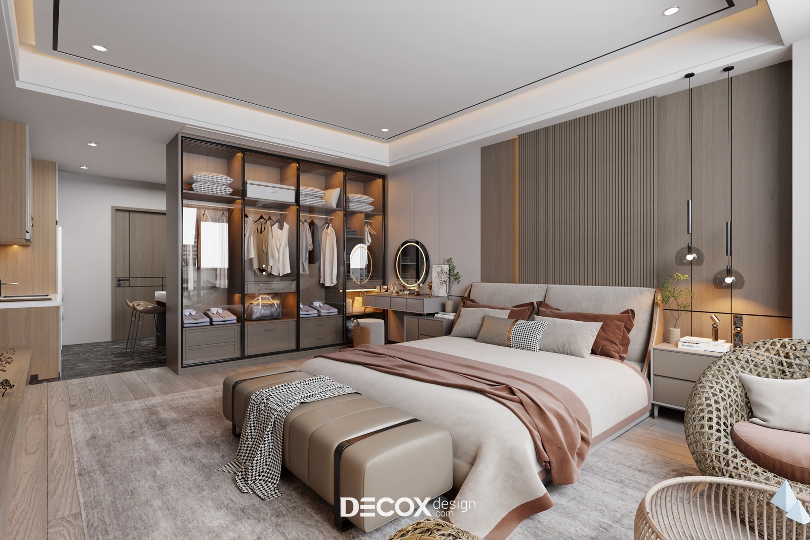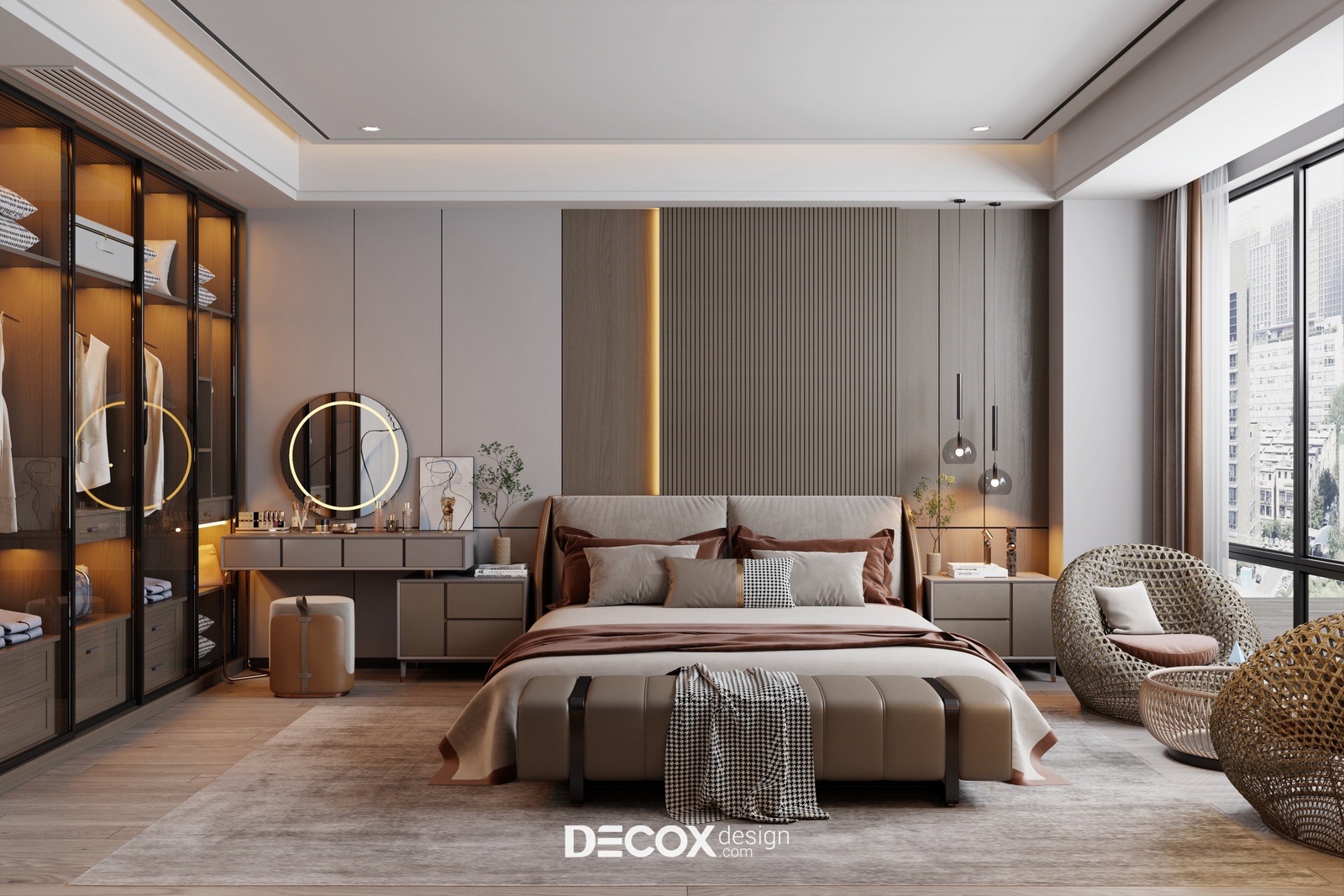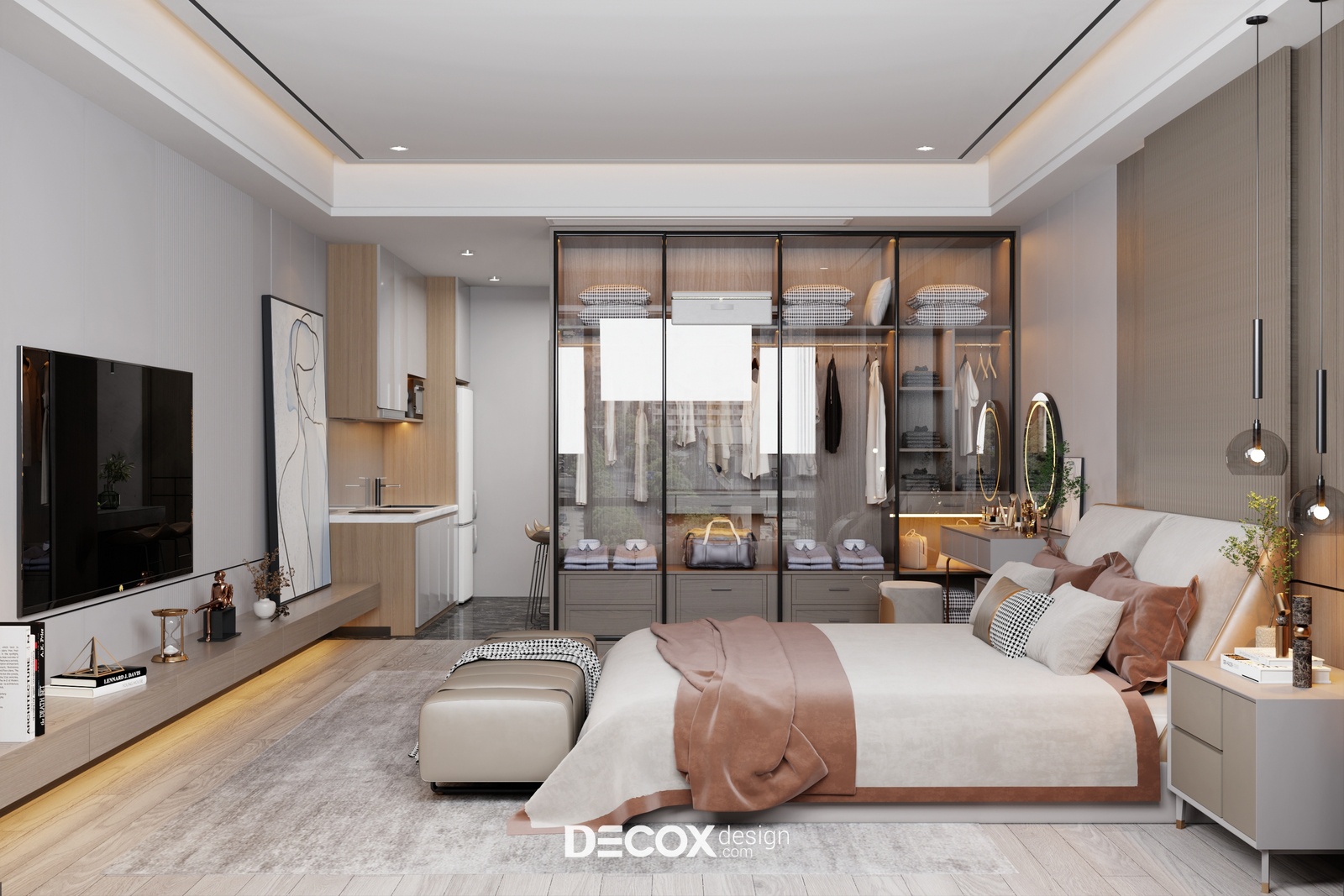 Phần lớn diện tích bên trong căn hộ được phân bổ dành cho khu vực phòng ngủ - chức năng chính của loại hình Serviced Apartment. Ngoài tone màu trung tính chủ đạo trên trần, tường và đồ nội thất KTS cũng kết hợp thêm chất liệu gỗ làm điểm nhấn trên tường và ốp sàn nhằm mang đến một không gian ấm cúng, mang lại sự thư giãn cao cho người sử dụng. Điểm nhấn đặc sắc trong không gian này phải kể đến vách lam gỗ ốp tường đầu giường được trang bị đèn led hắt đầy ấn tượng. Khu vực tiếp khách được tích hợp ngay bên trong không gian phòng ngủ đem đến hiệu quả thẩm mỹ lẫn công năng cao. Thay vì những bộ sofa chiếm khá nhiều diện tích KTS đã lựa chọn sử dụng hai chiếc ghế armchair nhỏ gọn được đan lát từ chất liệu mây tre kết hợp cùng một chiếc bàn trà đồng bộ và đặt chúng cạnh cửa sổ để khách hàng có thể vừa thưởng thức những tách trà nóng vừa chiêm ngưỡng quang cảnh thành phố tấp nập bên ngoài khung cửa kính.