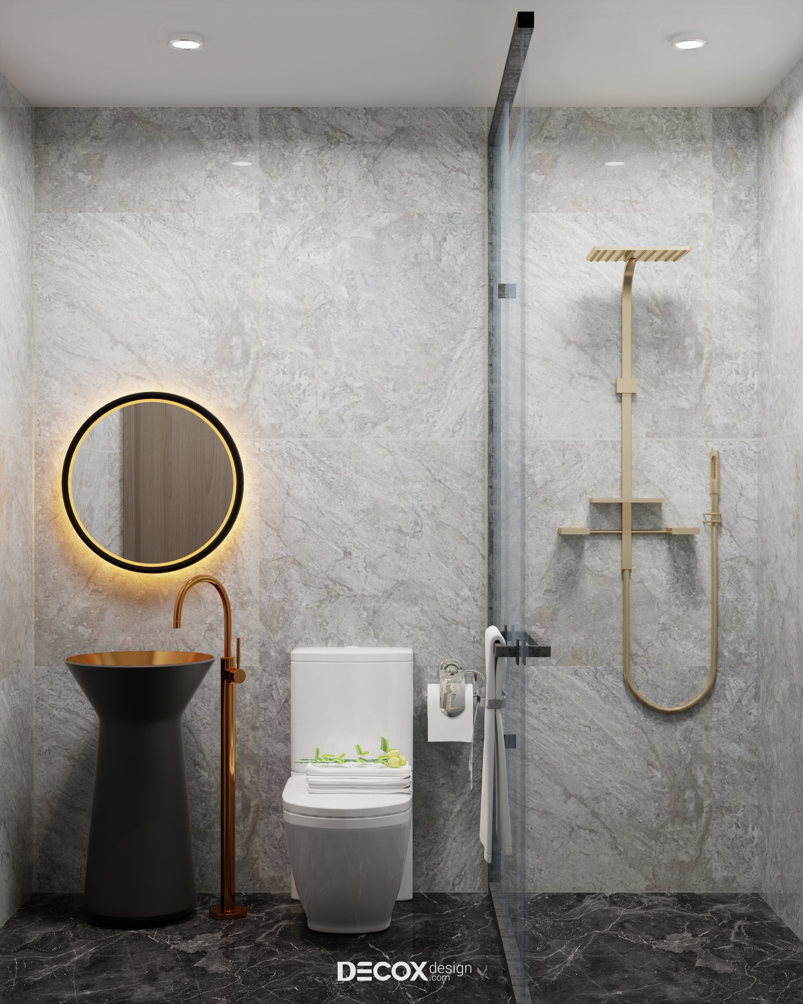 Cuối cùng là thiết kế nội thất khu vực phòng vệ sinh hiện đại, sang trọng. Chất liệu sử dụng chính trong không gian này là đá marble đen ốp toàn bộ các mặt tường và đá marble xám lát sàn, nhấn điểm cùng nội thất mạ vàng đã tạo nên một không gian đậm chất luxury.