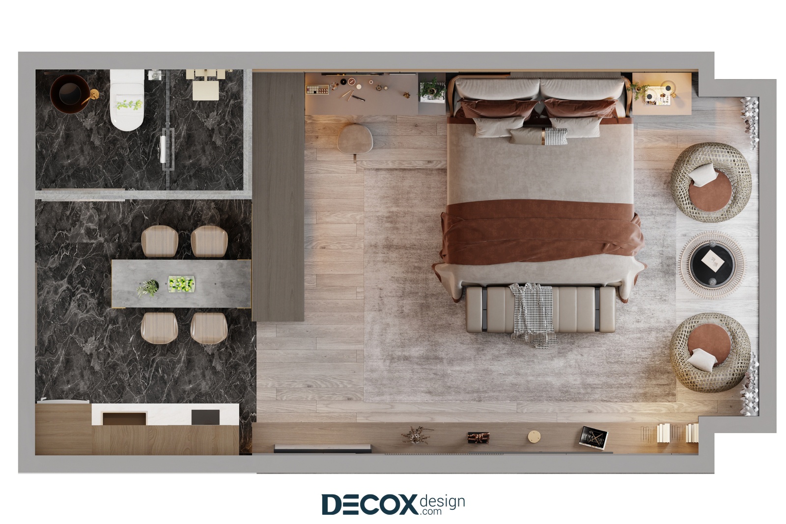 Thiết kế nội thất căn hộ dịch vụ Aristo diện tích 40m2 lấy tone màu trắng - xám chủ đạo nhấn điểm cùng tone màu ấm cúng của chất liệu gỗ đã kiến tạo nên một không gian hiện đại, tinh tế và sang trọng. Bố cục căn hộ được chia làm hai không gian chính, một dành cho khu vực nghỉ ngơi, tiếp khách và một dành cho tổ hợp nhà bếp - bàn ăn, WC. Nhìn chung, với lối phân chia không gian khoa học, bố trí nội thất tối giản kết hợp cùng hệ cửa kính full trần đã tiết kiệm tối đa diện tích đồng thời tối ưu hóa nguồn sáng vào nhà giúp căn hộ dịch vụ trở nên rộng rãi và thoáng đãng hơn rất nhiều. Đây cũng là giải pháp thường được sử dụng cho những căn hộ nhỏ. Sau đây, Decox Design mời bạn cùng tham quan không gian bên trong căn hộ dịch vụ này nhé.