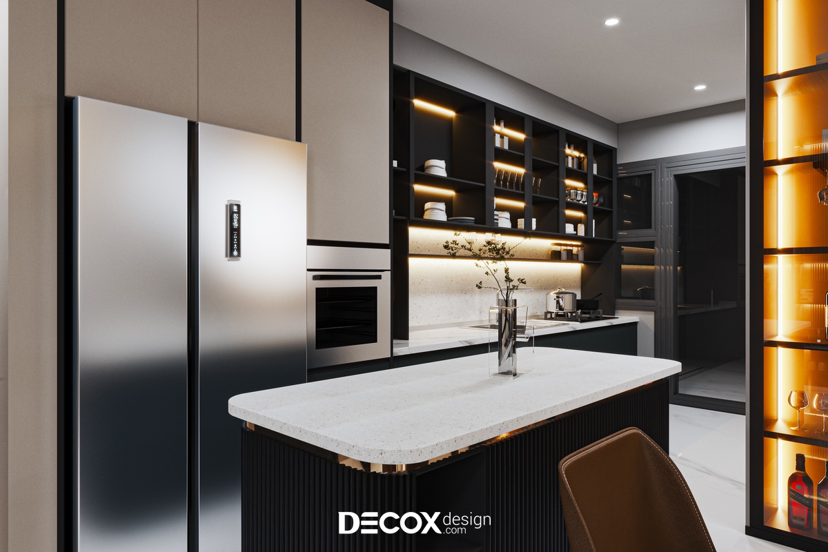 Khu vực bếp trong thiết kế nội thất chung cư này được bày trí thành một góc riêng, lúc này những đường thẳng tạo hiệu ứng thị giác phân tách không gian rất rõ ràng và tinh tế. Đá và kim loại là hai loại chất liệu mang đến vẻ đẹp hiện đại và sang trọng bởi màu sắc lạnh và cảm giác thời thượng, bên cạnh đó đây còn là hai chất liệu được lựa chọn thể hiện màu sắc đen - trắng đối lập nhau tạo thành điểm nhấn cho không gian.