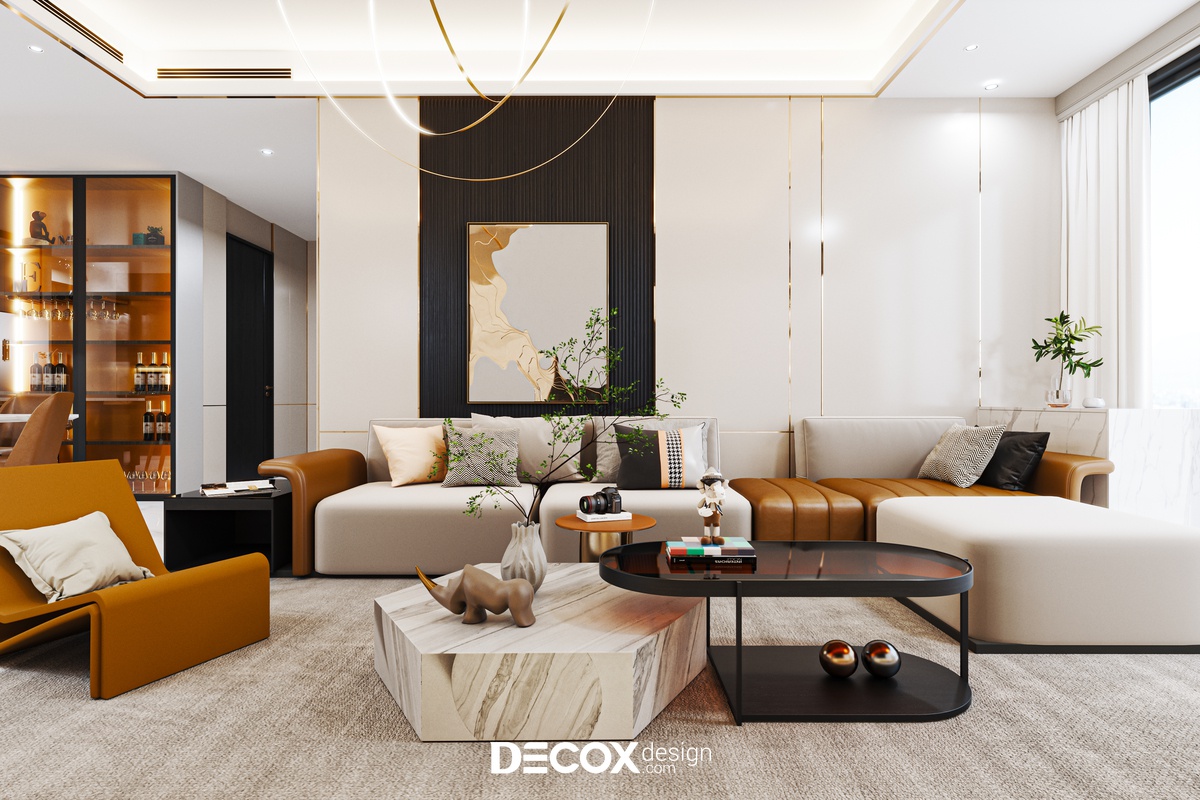 Phòng khách mang đầy đặc điểm của phong cách thiết kế hiện đại là chiếc bàn sofa hình lục giác hay tấm đá ốp tường TV hình chữ nhật đầy mạnh mẽ. Còn có cả những đường thẳng viền kim loại đầy dứt khoát chạy dài trên tường, tuy nhiên việc dùng quá nhiều những chi tiết này có thể sẽ khiến căn phòng bị khô cứng. Vậy nên KTS của Decox Design đã lựa chọn bộ ghế sofa bằng da với các góc được bo tròn, một vài chiếc ghế đơn có hình dáng là những đường cong uốn lượn duyên dáng, chiếc đèn trần là đường thẳng bị uốn cong lộ ra nét mềm mại. Một căn phòng khách được dung hòa giữa sự mạnh mẽ và dịu dàng tạo thành một tổng thể thống nhất và hài hòa.