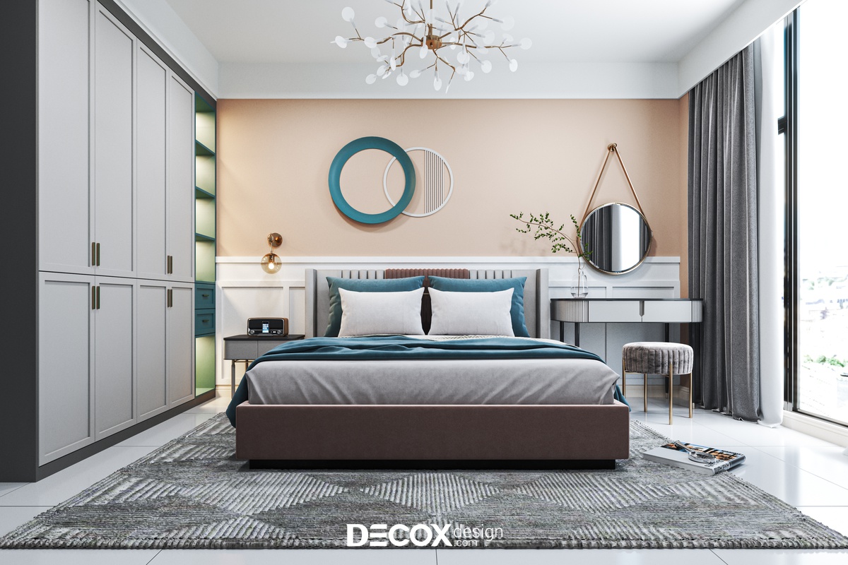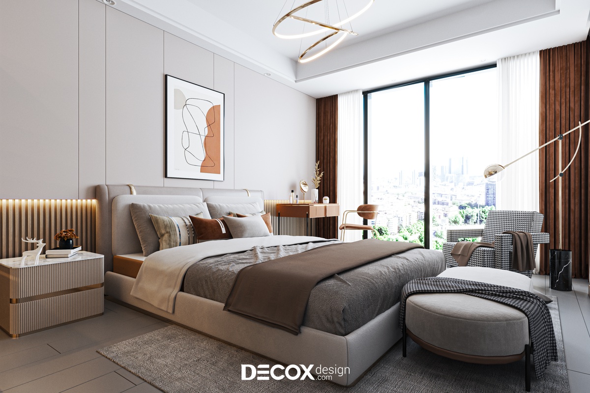 Thiết kế phòng ngủ có phần thiên về sự nhẹ nhàng và dịu nhẹ để tăng cảm giác thư giãn và thả lỏng cho gia chủ. Xu hướng vào những năm gần đây, cửa sổ sát đất khá được ưa chuộng để lựa chọn cho phòng ngủ, cửa sổ sát đất có thể khiến phòng ngủ có được tối đa ánh sáng tự nhiên tiết kiệm điện năng, đồng thời cũng giúp cho gia chủ cảm thấy được gần gũi với cảnh sắc bên ngoài.