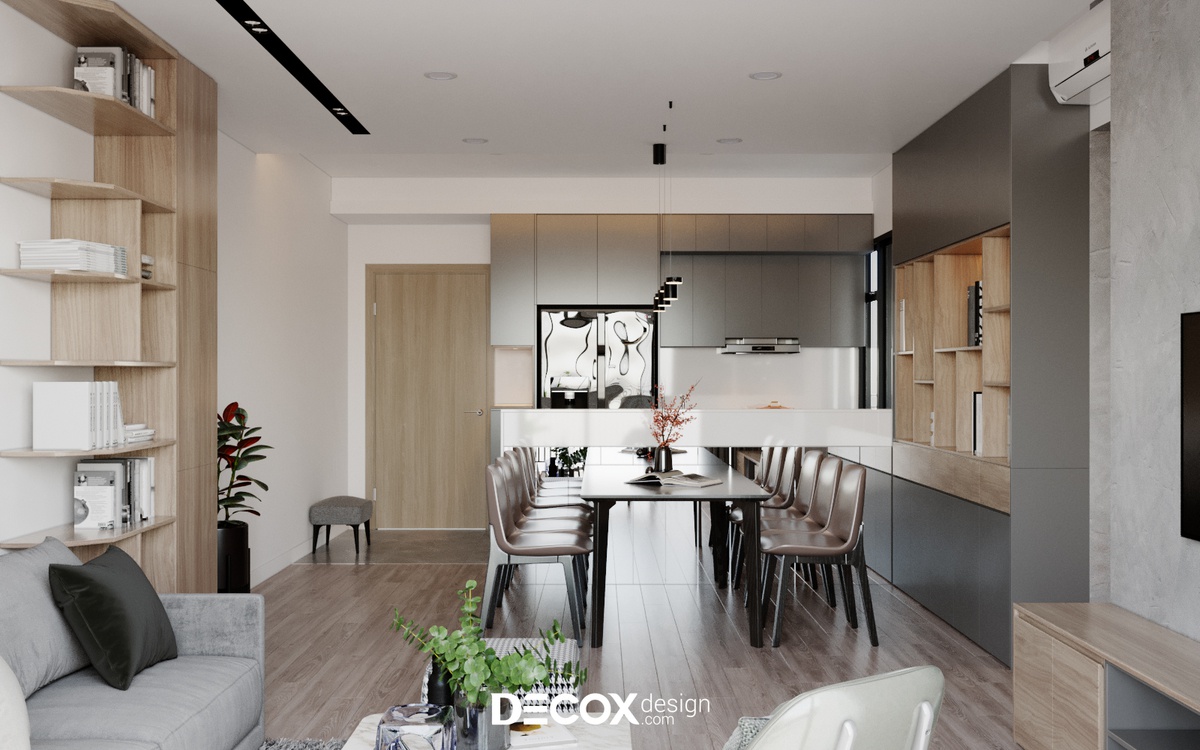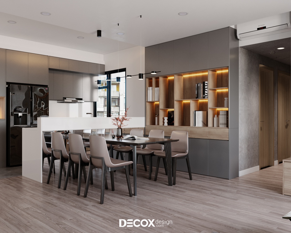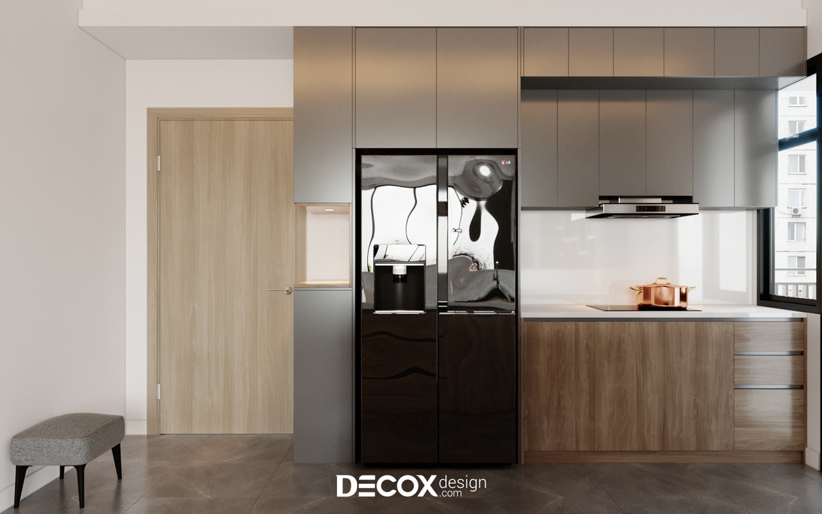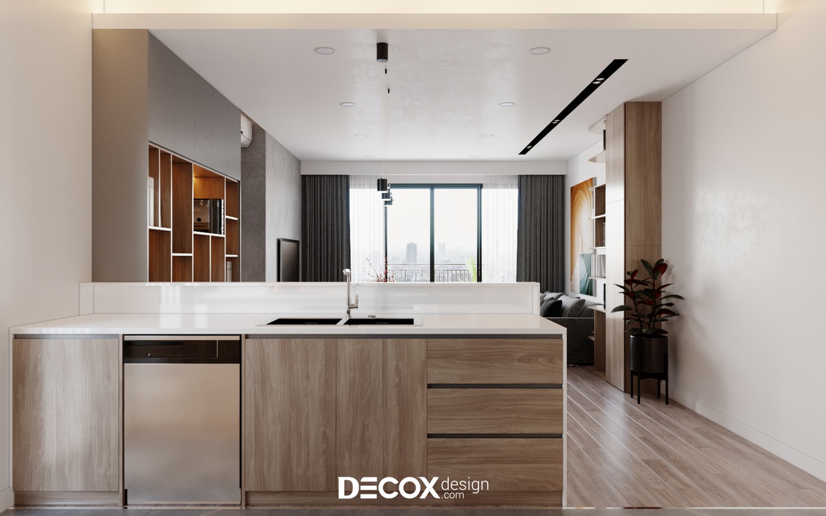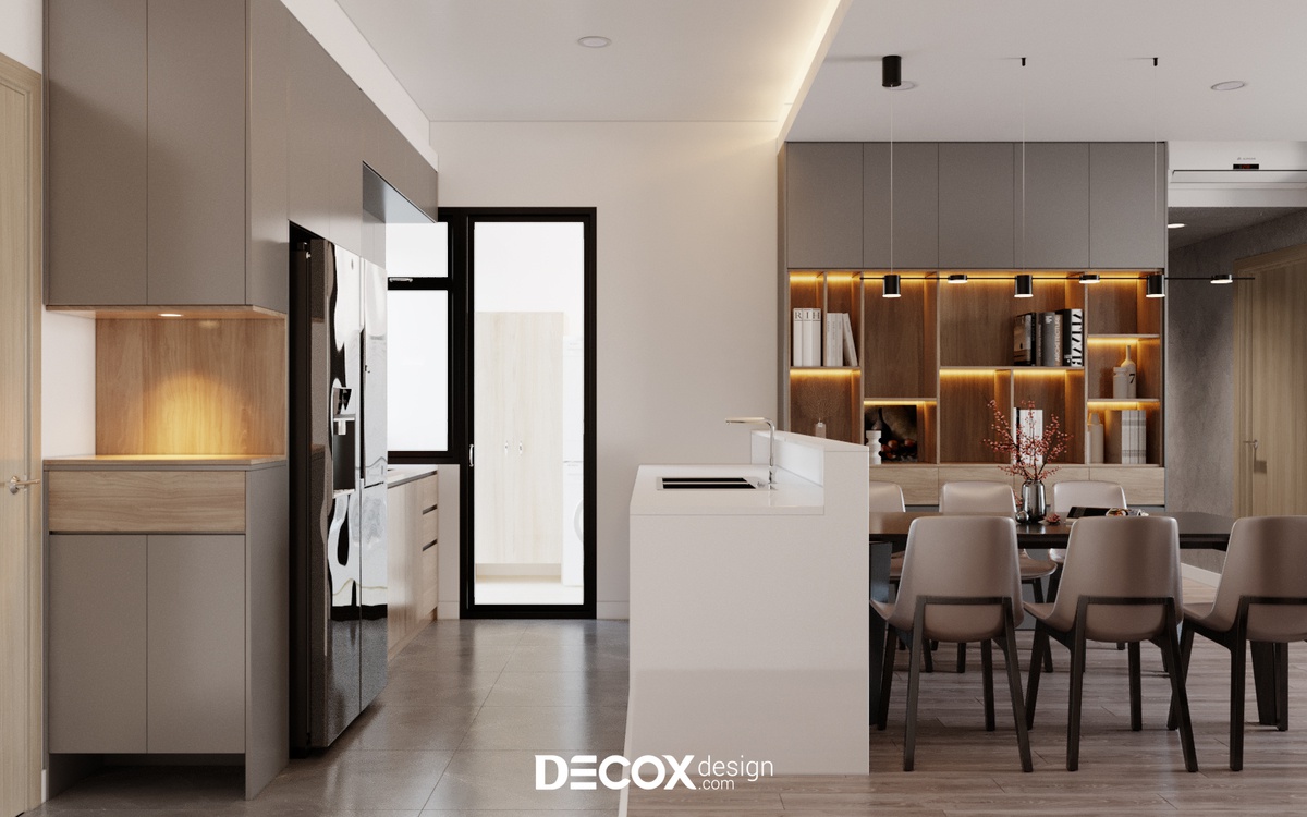 Trong các thiết kế nội thất chung cư, tính công năng và tiện nghi luôn là vấn đề được ưu tiên hàng đầu. Nhằm tối ưu hóa diện tích thì phòng bếp tinh gọn chính là một điểm cộng tuyệt vời. Thấu hiểu được điều này, Decox Design đã bố trí đồng thời cả hệ tủ bếp trên, dưới và bên mặt hông của các góc cạnh, điều này giúp cho gia chủ tăng thêm không gian lưu trữ đồ đạc.