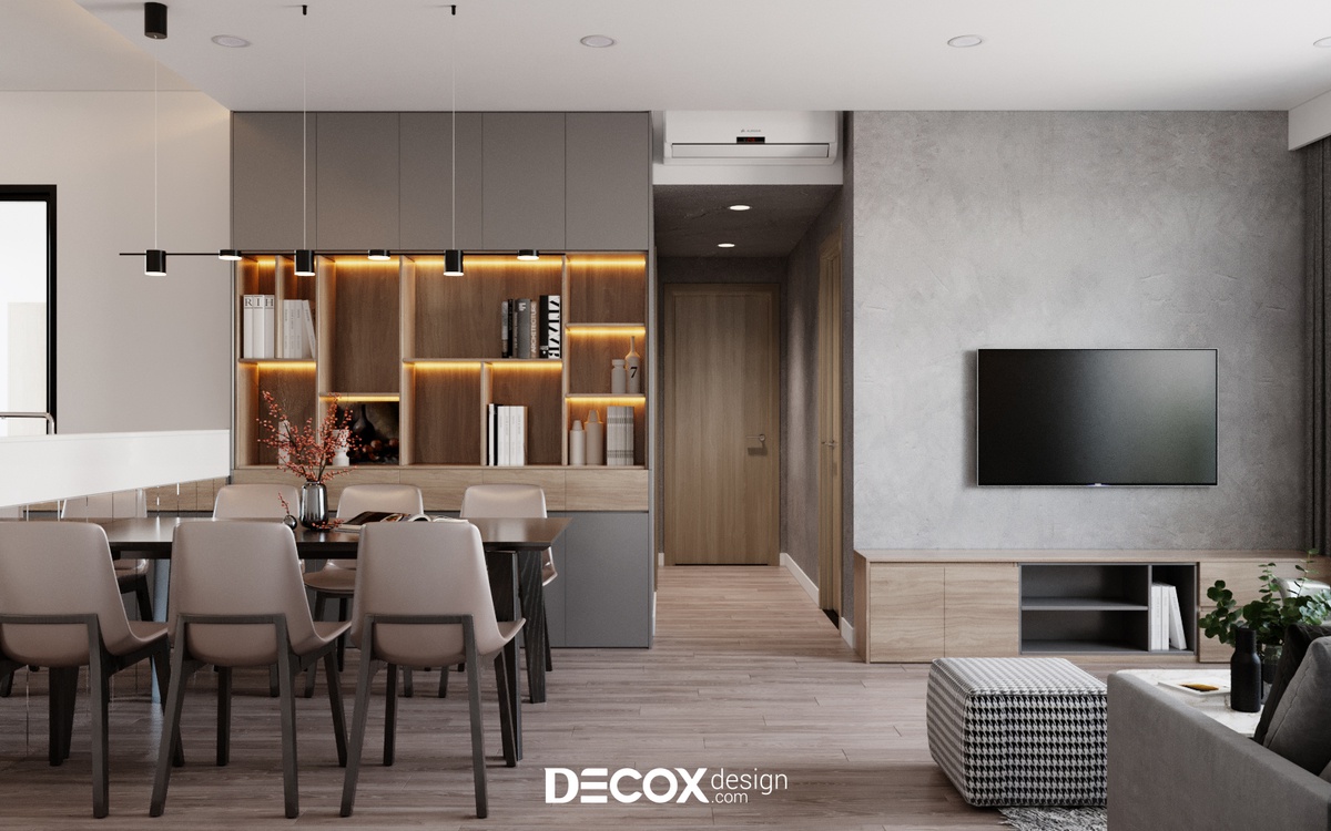 Phong cách hiện đại - một trong những phong cách được ưa chuộng nhất trên thị trường thiết kế nội thất hiện nay đã được Decox Design đưa vào trong dự án căn hộ Palm Heights lần này. Bên cạnh tone trắng chủ đạo KTS còn lồng ghép thêm những yếu tố khác như nội thất màu trung tính, hệ thống đèn led nhấn điểm cùng chất liệu bê tông tạo nên nét đẹp tinh tế nhưng cũng không kém phần mạnh mẽ, cá tính.