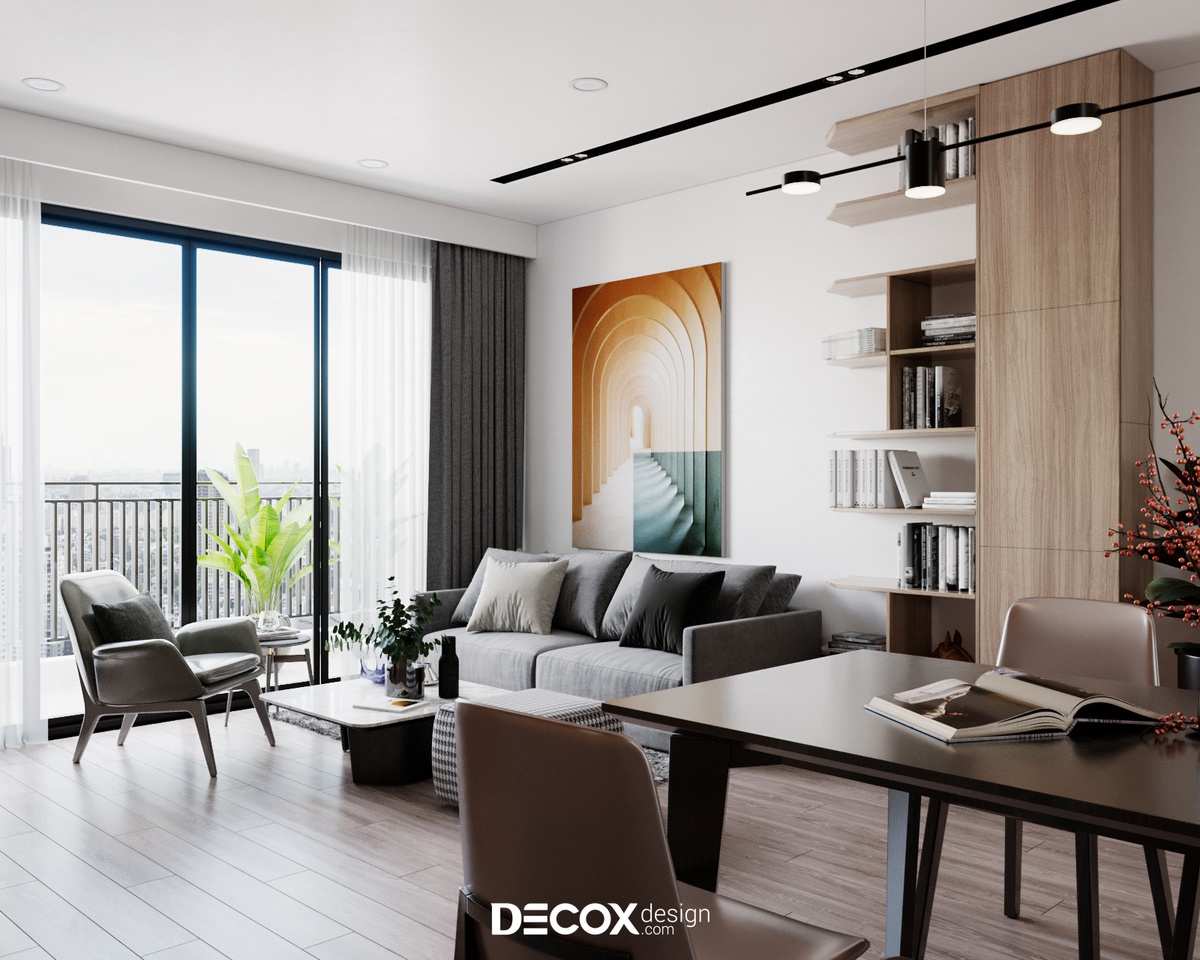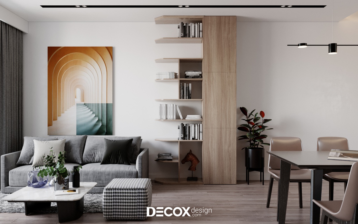 Nhờ ưu thế tone nền trắng hoàn hảo việc thiết lập, sắp xếp nội thất gam màu trung tính trở nên dễ dàng và hài hòa hơn bao giờ hết. Với mẫu thiết kế phòng khách này, Decox Design chủ yếu dùng chất liệu gỗ nhằm tăng thêm nét sang trọng và tinh tế cho không gian. Mặt khác, treo thêm bức tranh nghệ thuật khổ lớn trên nền tường trắng sẽ giúp thu hút sự chú ý và làm điểm nhấn cho khu vực sofa - trung tâm phòng khách.