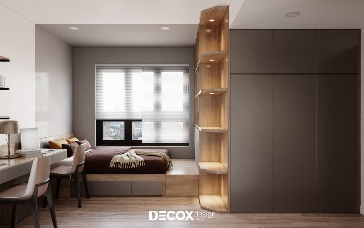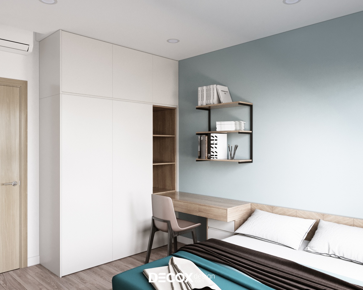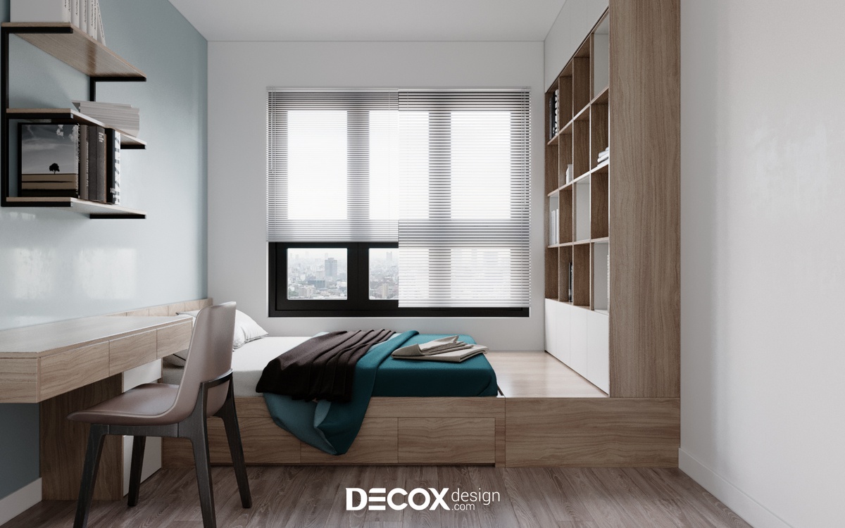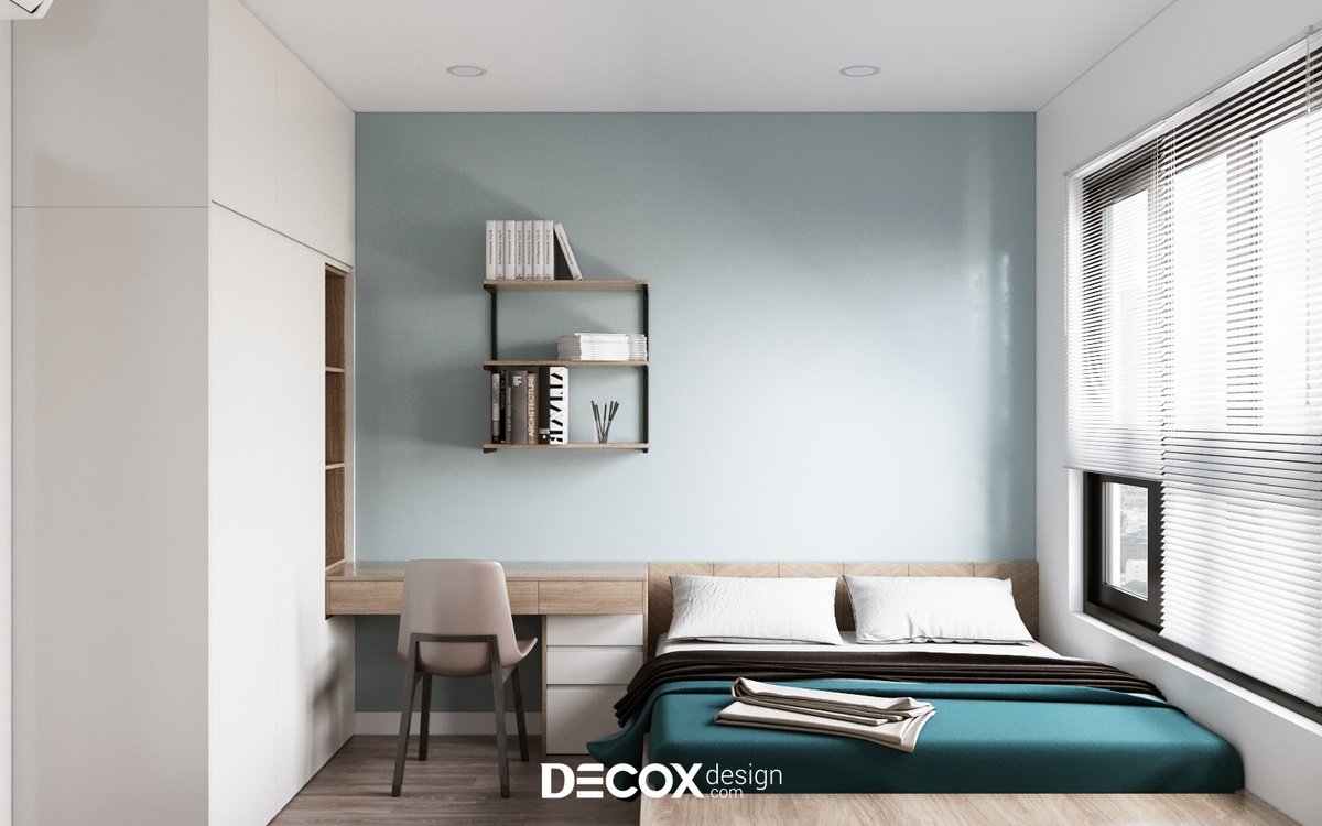 Với diện tích không quá vượt trội thì nội thất đa năng luôn là ưu tiên hàng đầu được các KTS lựa chọn nhằm kiến tạo nên một không gian đảm bảo thẩm mỹ lẫn công năng. Decox Design đã lựa chọn tone trắng - xanh kết hợp tạo sự tươi mới cho không gian. Bên cạnh đó, hệ giường phản & kệ lưu trữ & bàn làm việc được đặt thiết kế riêng theo số đo phòng cũng là điểm đặc biệt trong mẫu thiết kế phòng ngủ này.