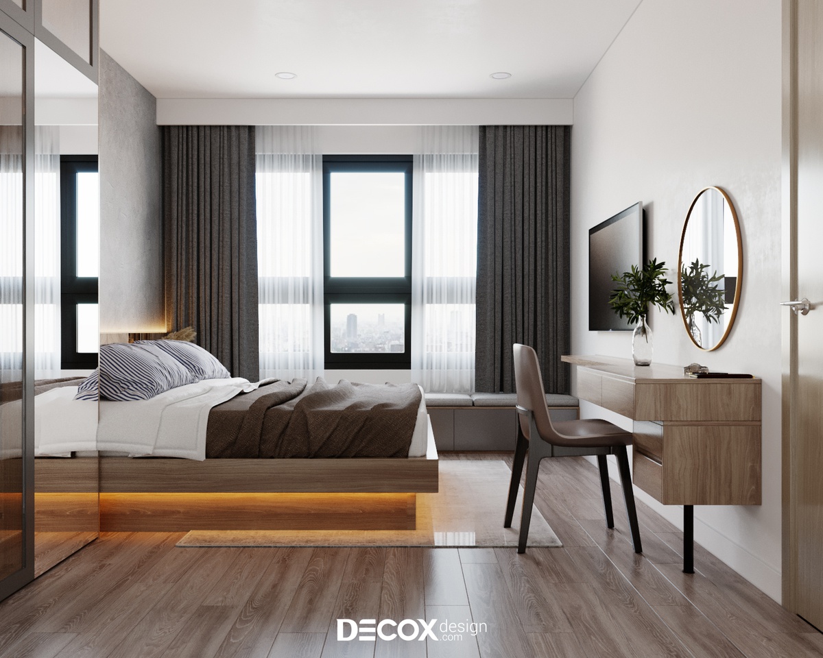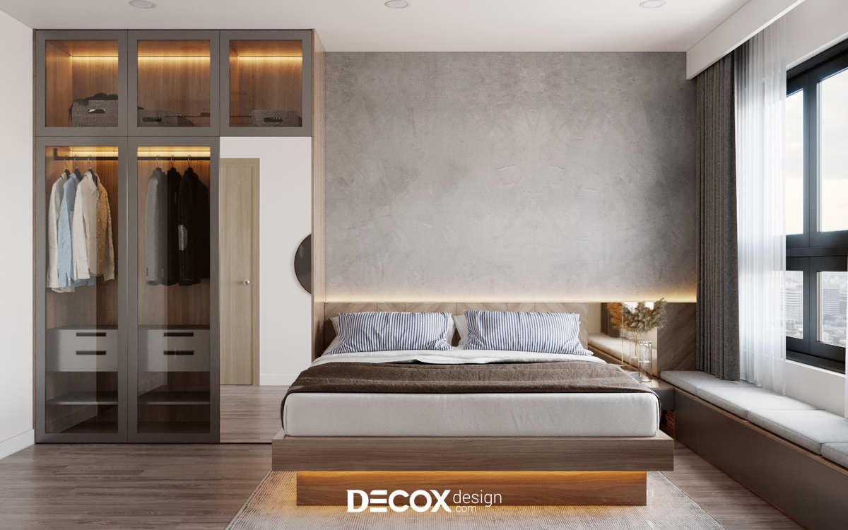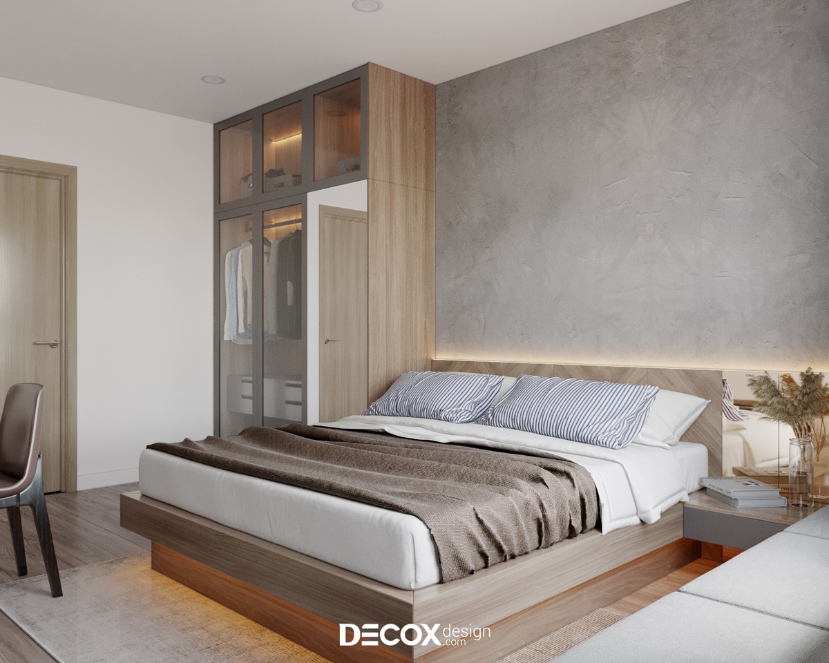 Để không gian dành cho việc nghỉ ngơi không bị chi phối bởi những việc khác cũng như đảm bảo chất lượng giấc ngủ của gia chủ được trọn vẹn, KTS Decox Design đã ưu tiên thiết kế không gian phòng ngủ master theo hướng hiện đại, tối giản. Ngoài các nội thất cần thiết thì một khung cửa sổ rộng có thể ngắm nhìn thành phố và đón sáng là đủ cho khu vực này.